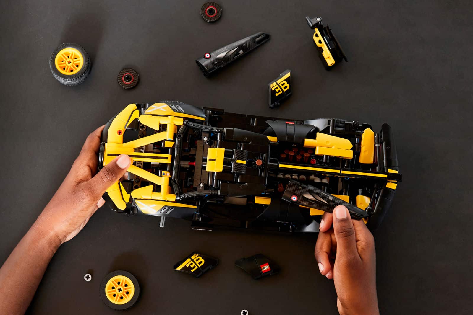 Das Lego-Modell ist mit authentischen Aufklebern versehen, um die ultimative Weiterentwicklung von Bugattis Designphilosophie „Form follows Performance“ beim Bolide wiederzugeben.