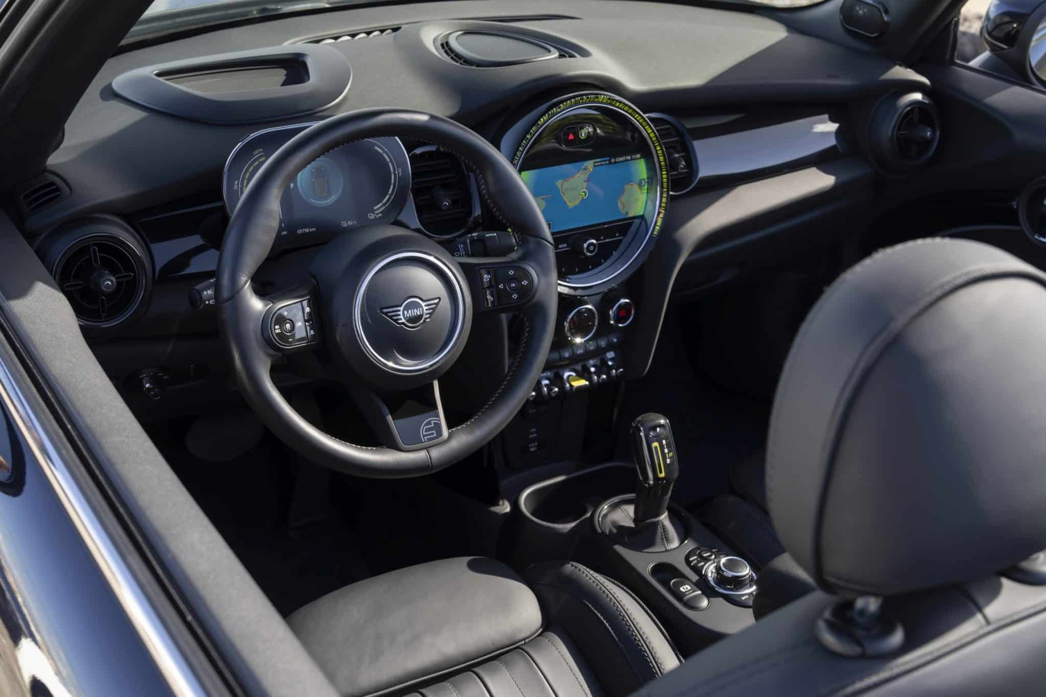 Der Mini Cooper SE Cabrio ist in den Farbtönen Enigmatic Black und White Silver erhältlich. Dazu kommen kleine Außenakzente in Resolute Bronze sowie unter anderem beheizbare Leder-Sportsitze mit verstellbarer Oberschenkelauflage.