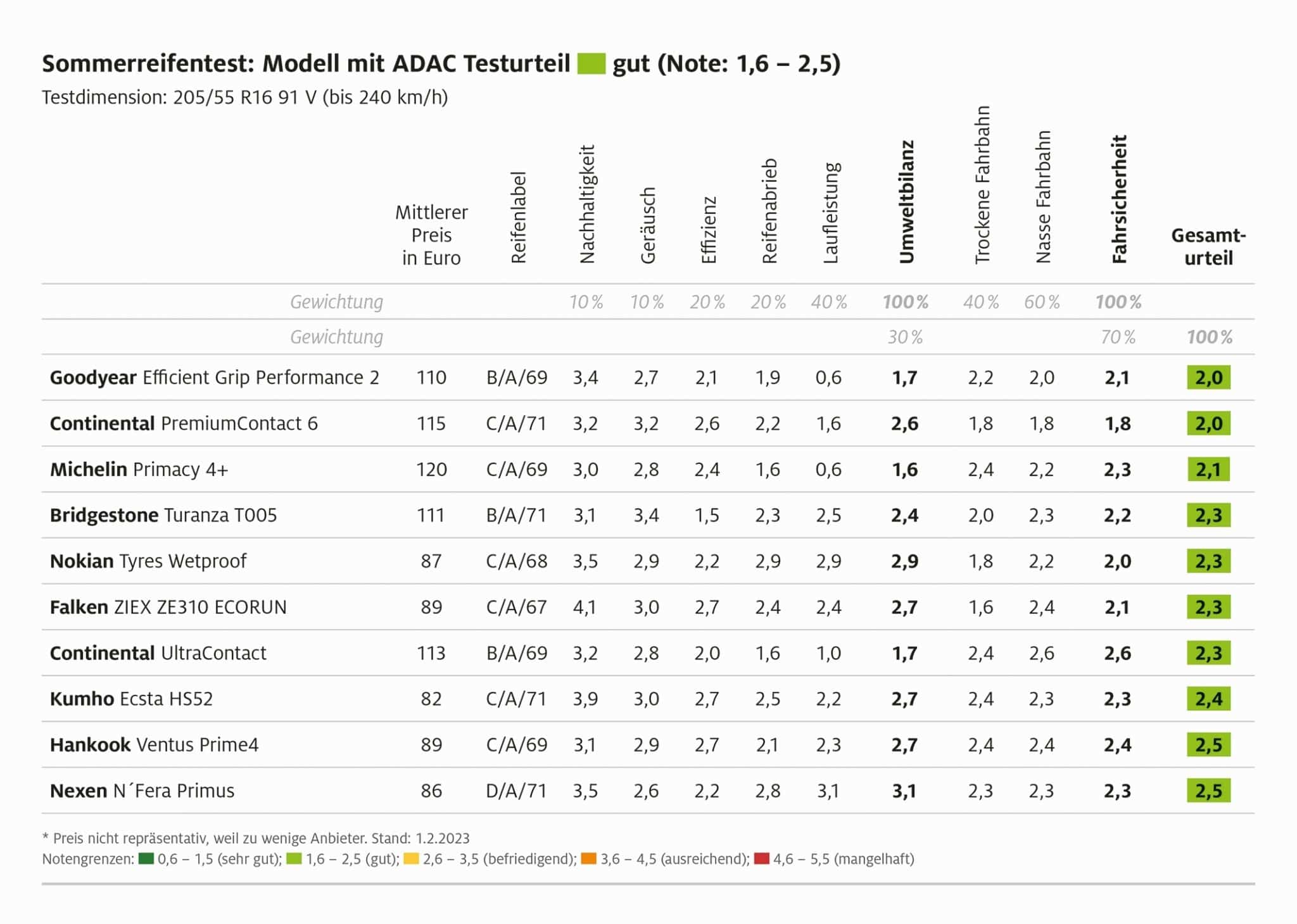 Im Sommerreifen Test 2023 des ADAC schnitt der Goodyear Efficient Grip Performance 2 am besten ab. Auf Platz zwei folgt der Continental Premium Contact 6.