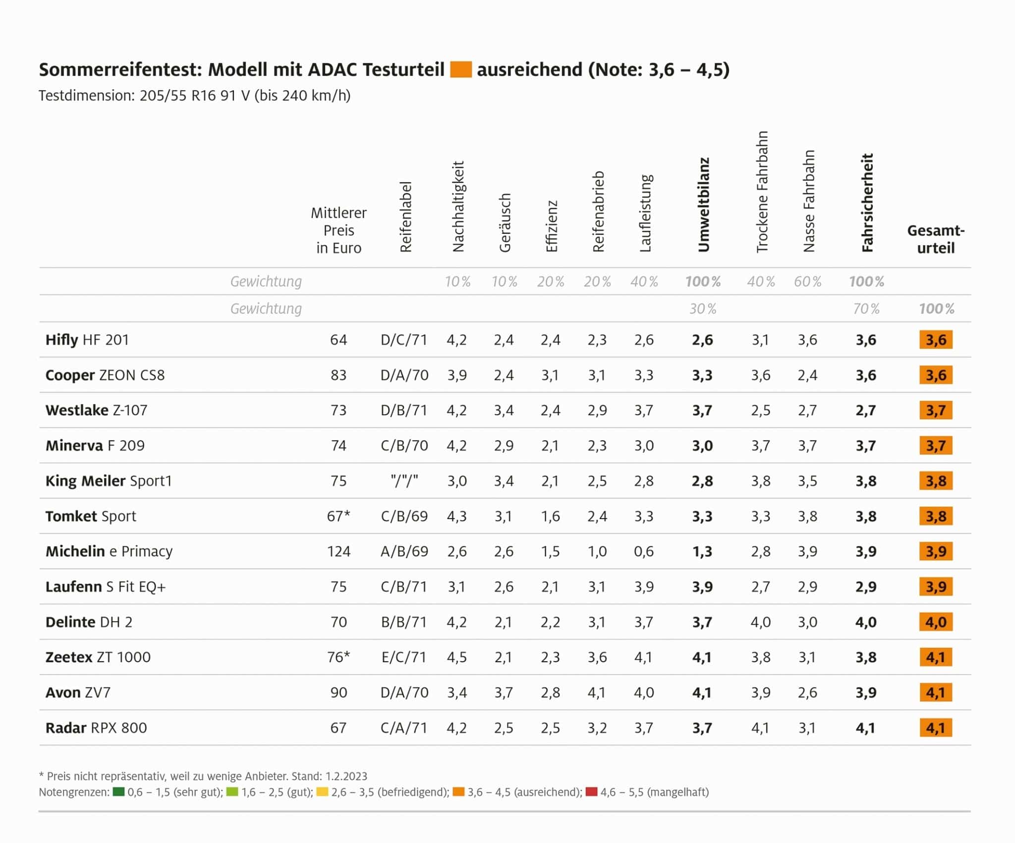 Die Entscheidung, so betont der Automobilclub, sollte aber auf keinem Fall allein vom Preis abhängen, wie die vielen günstigen Produkte im aktuellen Test mit ihren großen Schwächen besonders auf nasser Fahrbahn zeigen. (we/aum)(Grafiken: ADAC)