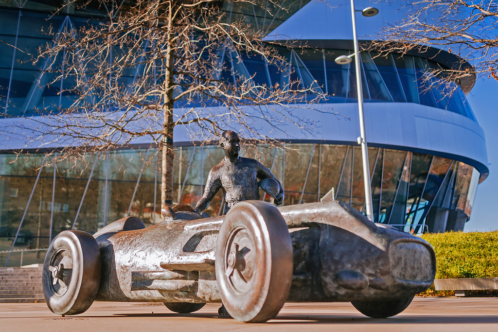 Bronzeskulptur „Juan Manuel Fangio“ am Mercedes-Benz Museum