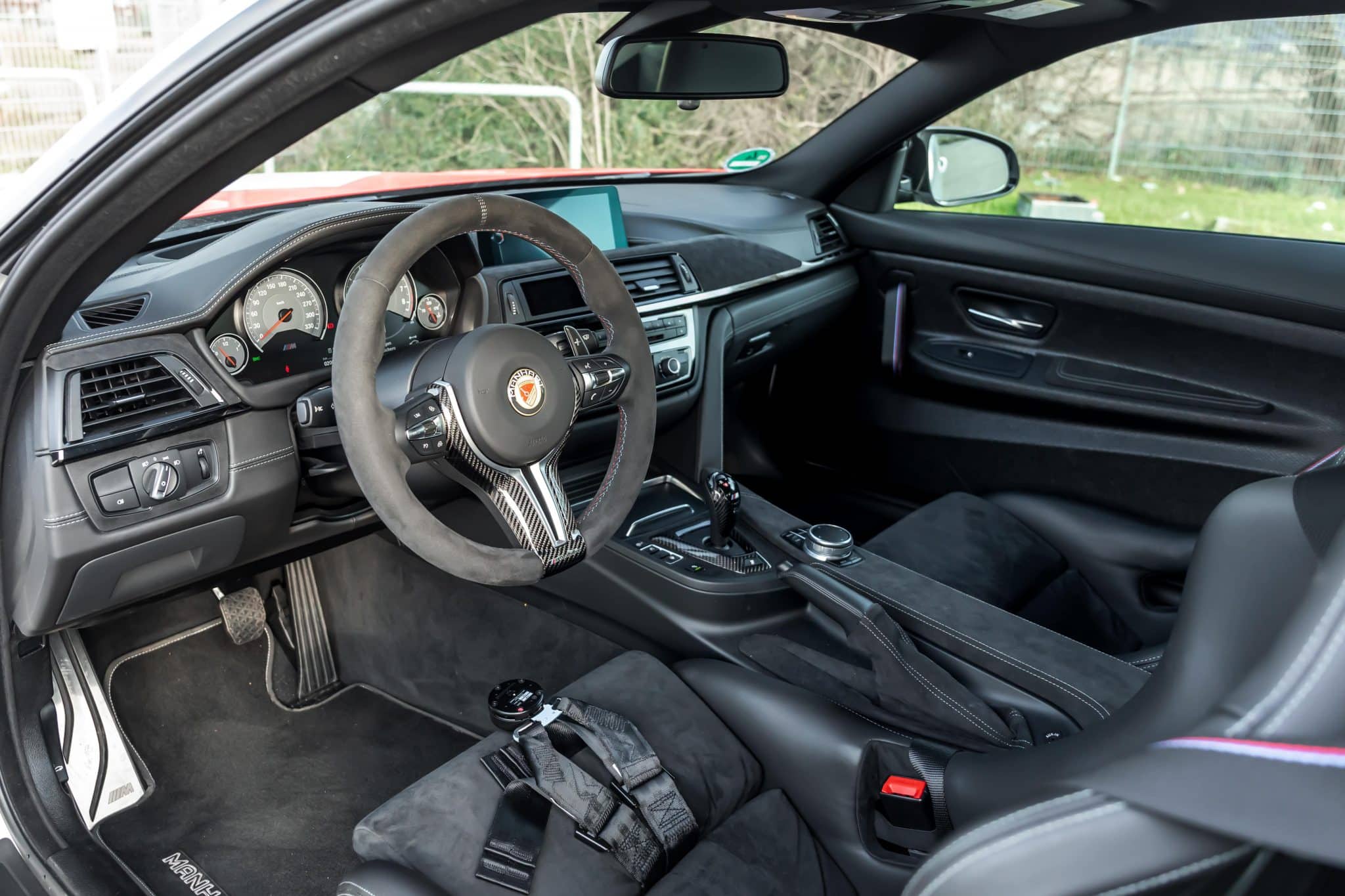 Den schon ab Werk mit unter anderem Recaro-Carbon-Schalensitzen und einem Überrollkäfig sehr motorsportlich ausgerüsteten Innenraum werteten Die BMW Tuning Profis mit einen Awron-Zusatzdisplay auf. Dieses ersetzt wie gewohnt eine der mittigen Lüftungsdüsen im Cockpit. (Fotos: Manhart Performance)