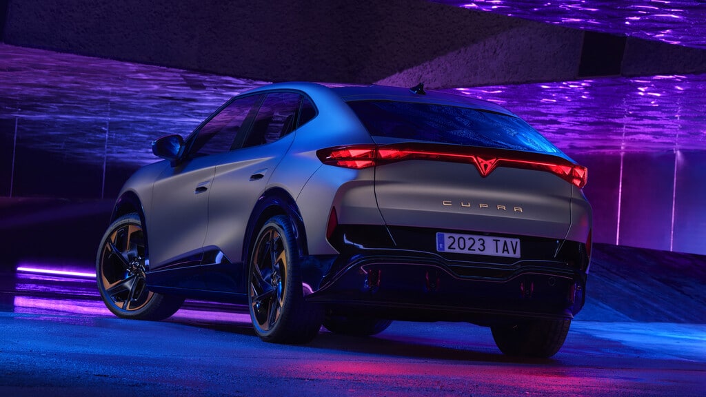 Auffällig auch die großen Radausschnitte, in den denen sich bis zu 21 Zoll große Alu-Räder drehen können. Das Heck wiederum wird von einem durchgehenden Lichtband dominiert, das die markanten Rückleuchten verbindet und in dessen Mitte das Cupra-Logo rot aufscheint.