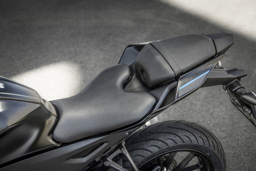 Dazu zählt natürlich nicht zuletzt der kleine zentrale LED-Hauptscheinwerfer. Die Aerodynamik hat sich laut Yamaha um fünf Prozent verbessert. Wie bei der großen Schwester hat nun auch die R 125 Schlitze in der oberen Gabelbrücke. Das neue Bodywork präsentiert sich in der Seitenansicht in horizontal verlaufender Linie, das geänderte Tankcover dient der besseren Ergonomie. Der Fahrersitz bietet auch nach hinten ausreichend Platz.
