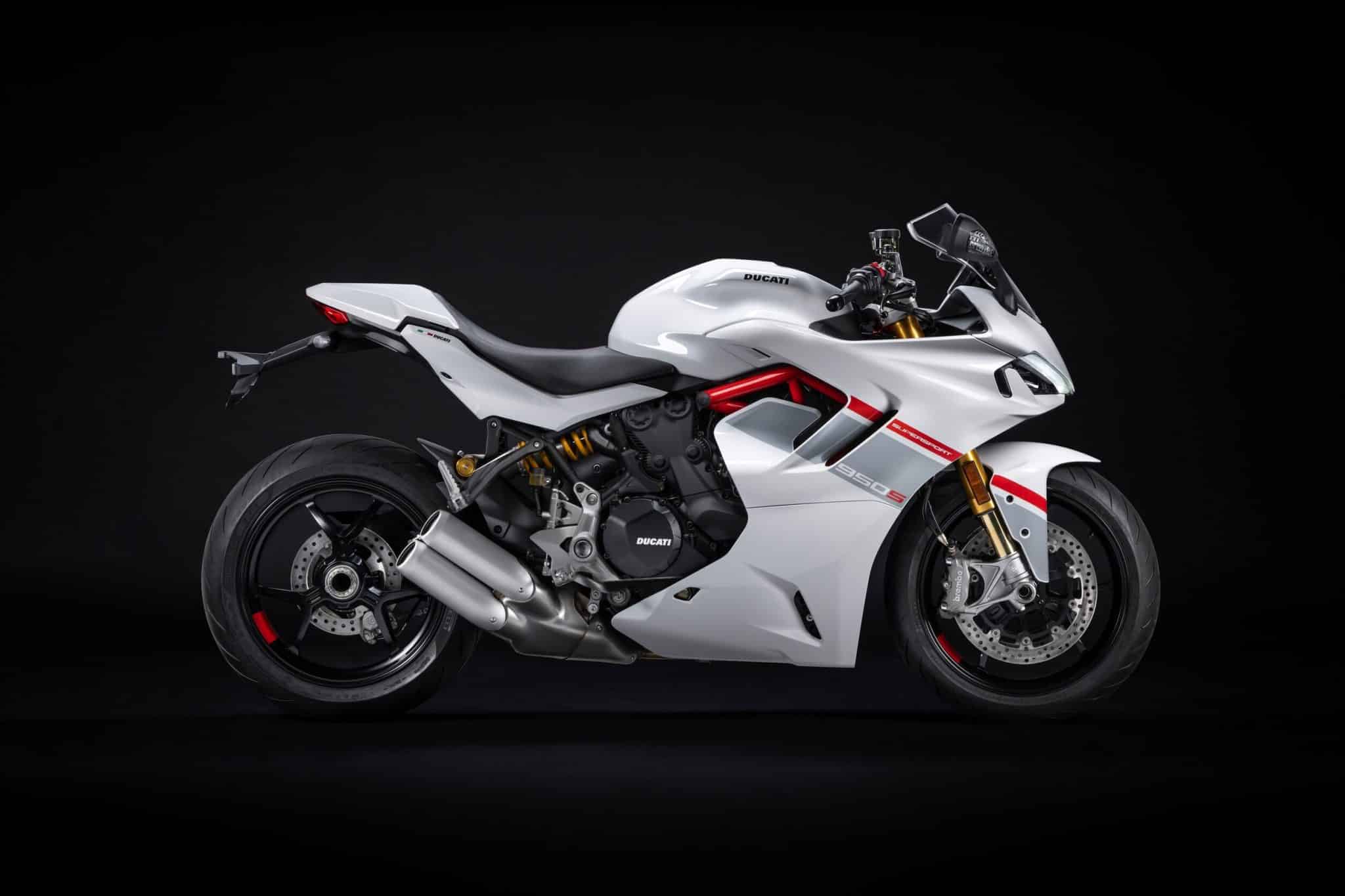 Auffallend an der Ducati Supersport 950 S Stripe Livery ist ein schmaler roter und ein breiter grauer Streifen (Stripe) auf der Grundfarbe „Iceberg White“.