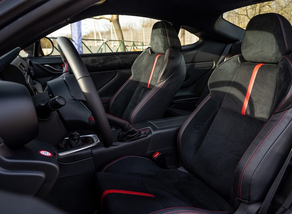 Rote Ziernähte, Alcantarabespannung der Cockpithutze und der oberen Fensterkante für die Ellbogenauflage sowie Kunstleder in den Inlets der Tür vermitteln ausreichend Sportatmosphäre. Die breiten und tief liegenden Türschweller fordern durchaus eine gewisse Beweglichkeit beim Ein- und Aussteigen.