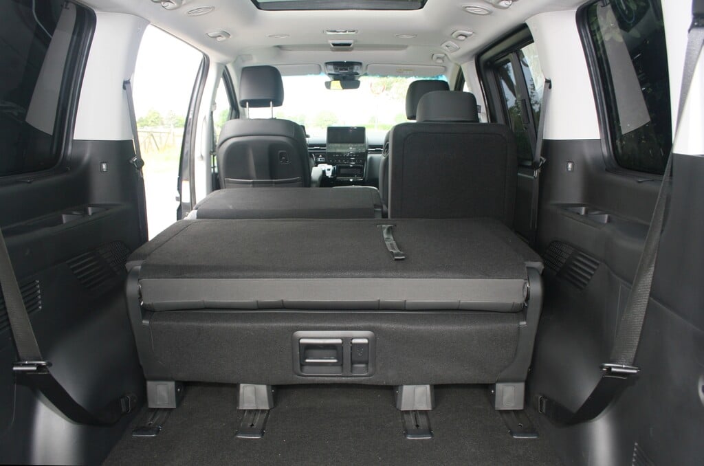 Auf Wunsch können aber für 1200 Euro ein Panorama- für die Mitte und ein Glasschiebedach über der vorderen Reihe bestellt werden. Dort kann übrigens die mittlere Rückenlehne zur einer Ablage mit drei Fächern und Cupholdern für Fahrer und Beifahrer umgeklappt werden.