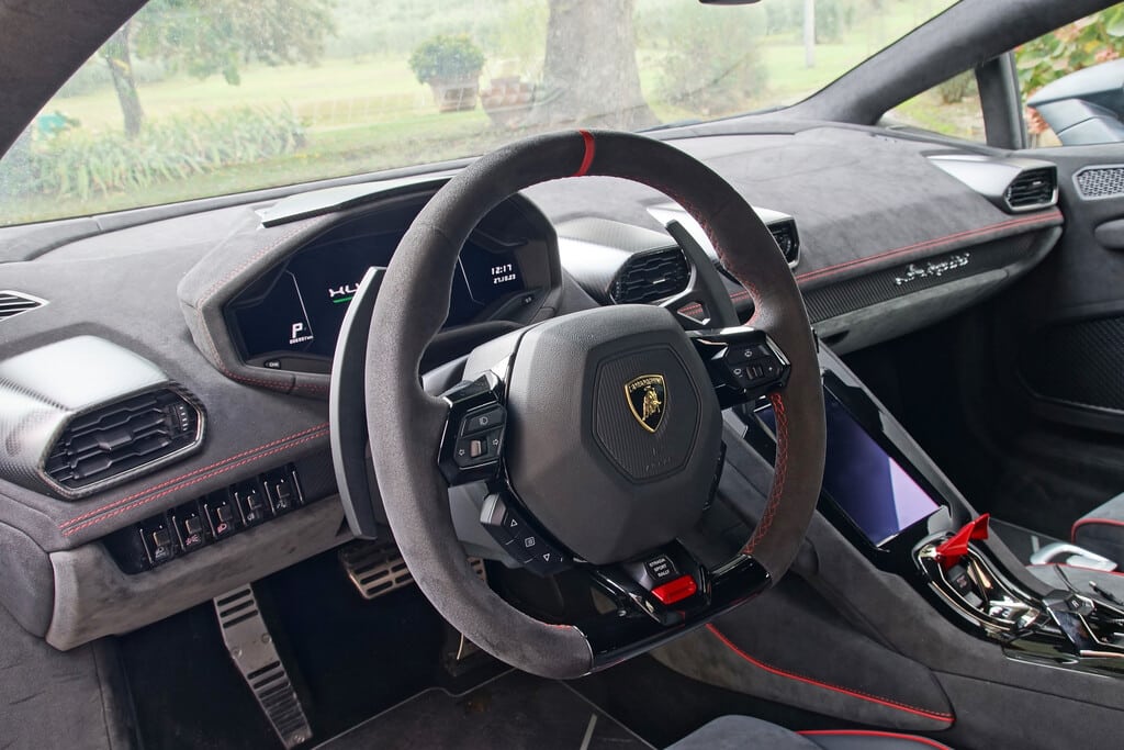 Wie bei jedem Huracán ist schon der Startvorgang eine Schau. Man legt die rote Spange über dem Startknopf um, eine schöne Reminiszenz an Flugzeugcockpits. Jetzt ist der Weg frei, um per Knopfdruck das Triebwerk zu starten und die Fahrt zu beginnen.