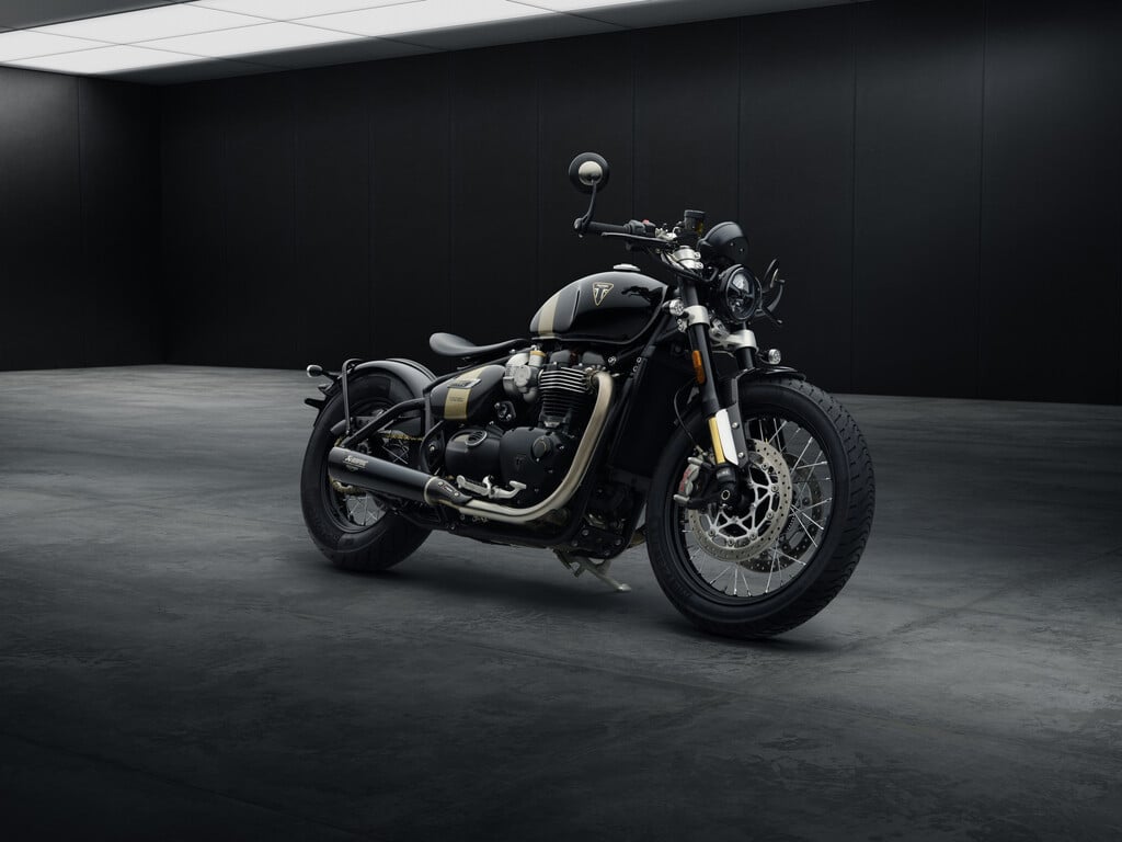 Die Triumph Bobber TFC hat einen Clip-on-Lenker und den zusätzlichen Fahrmodus „Sport“. Sie wiegt über fünf Kilogramm weniger als die Standardausführung. Ausgestattet ist sie außerdem mit Fahrwerkskomponenten von Öhlins, goldenen Gabelstandrohren und einem Ledersitz mit eingeprägten Marken-Logo.