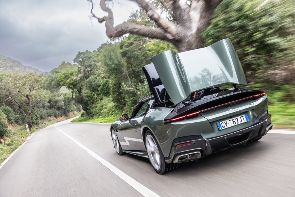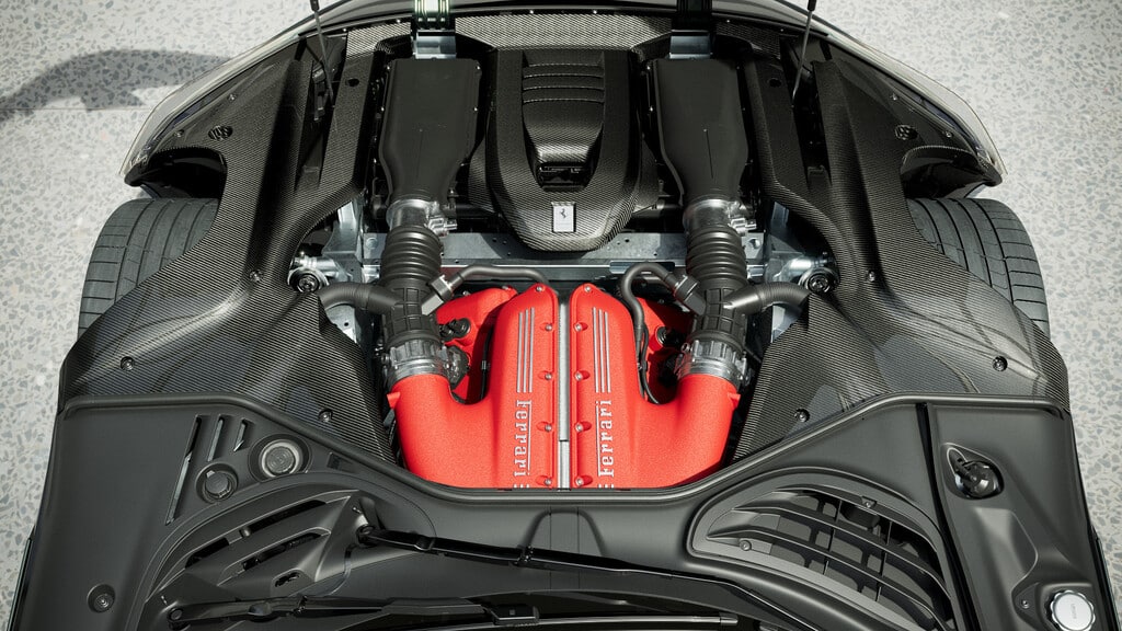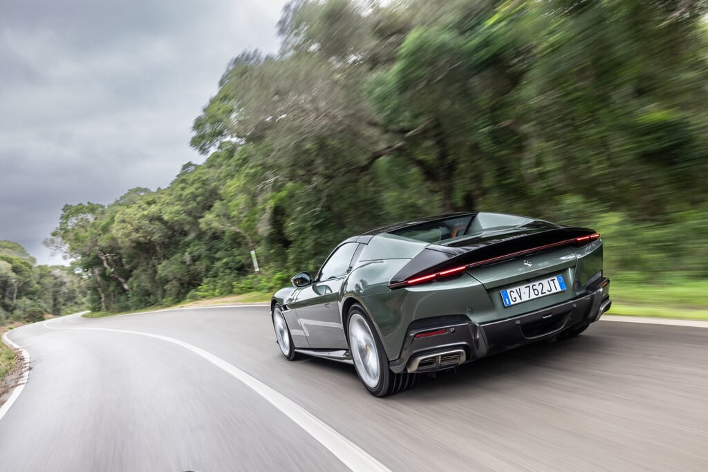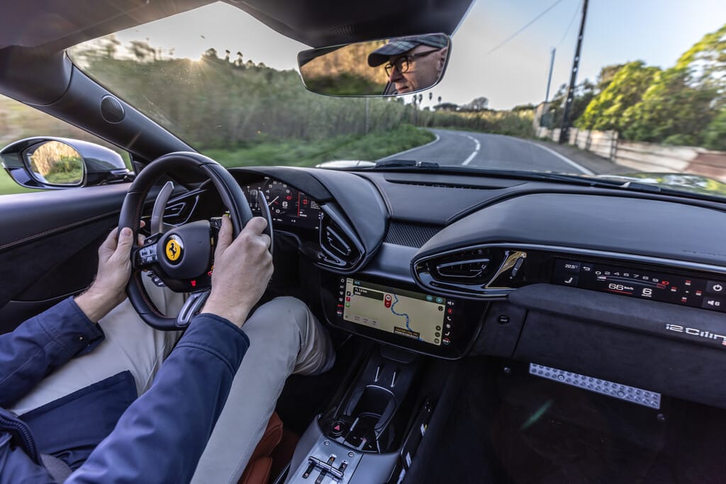 Schon beim Coupé des 12Cilindri ist man dem Zwölfzylinder sehr nah: Das Aggregat sitzt hinter der Vorderachse, ist also ein Front-Mittelmotor, und ragt damit weit in den Innenraum hinein. Das schafft eine geradezu intime Nähe zwischen Fahrer und Motor. Das Doppelkupplungsgetriebe liegt hinten an der Hinterachse und sorgt so für eine optimale Balance des Autos.