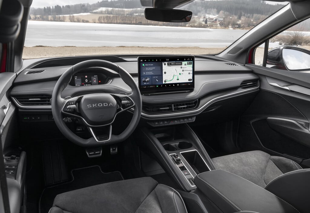 Im Innenraum unsere Test Skoda Enyaq 2025 wagt nichts Neues. Die Bedienung erfolgt über einen zentralen 13-Zoll-Touchscreen, der mittlerweile zur Serienausstattung gehört. Für diejenigen, die es lieber haptisch haben, gibt es immerhin einige Schnellzugriffstasten unter dem Bildschirm sowie Knöpfe und Drehregler auf dem Lenkrad.