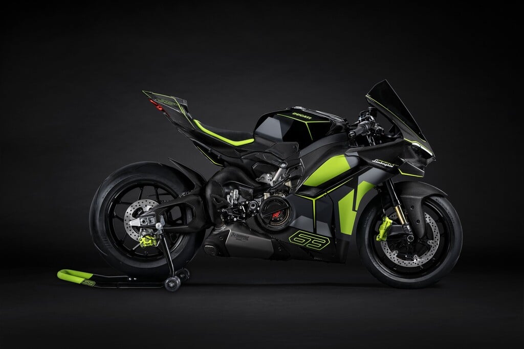 Die geschmiedeten Aluminiumfelgen im Stil des Revuelto wurden speziell für die Ducati Panigale V4 Lamborghini entworfen. Heck und Winglets wurden nach dem Vorbild des Supersportwagens überarbeitet. Das exklusive Modell trägt schwarzes Sichtcarbon. Details sind in Verde Scandal, Grigio Telesto und Grigio Acheso ausgeführt.