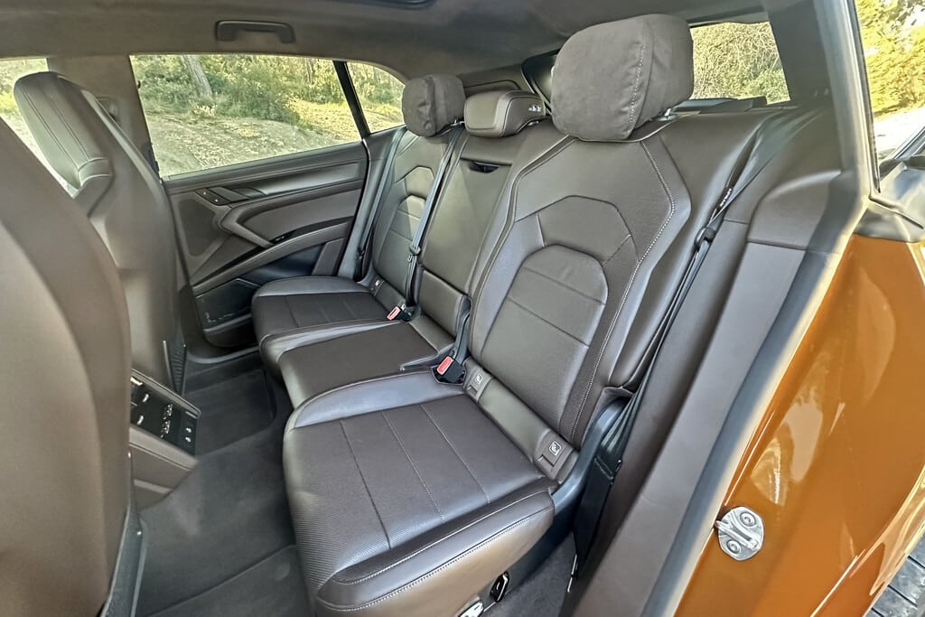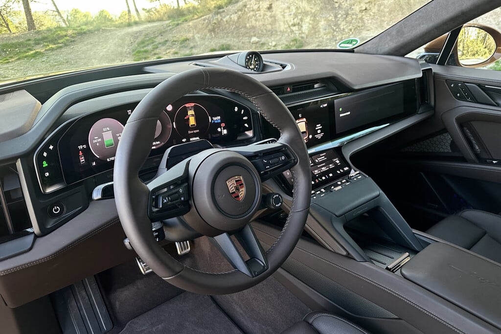 Beim Einsteigen fällt sofort die ungewohnt tiefe Sitzposition auf – rund sieben Zentimeter tiefer als im Verbrenner. Das Offroad-Gefühl rückt in den Hintergrund, stattdessen entsteht ein Eindruck, der näher am Panamera liegt als an einem SUV. Die optionalen Sportsitze verstärken dieses Gefühl. Der Seitenhalt ist präzise, fast schon kompromisslos.