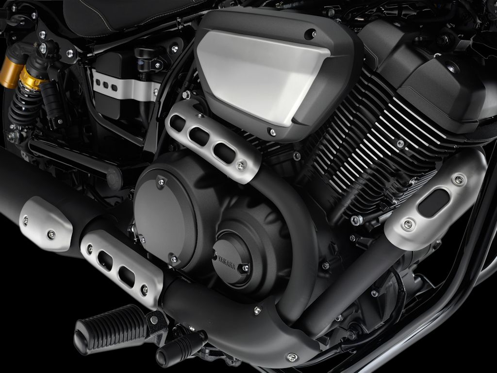 Passend zum neuen Einspritzkennfeld und um dem Motor im mittleren und unteren Drehzahlbereich zusätzlich Schub zu verleihen, haben die XV950 Modelle eine neu entwickelte Auspuffanlage. Der rechts am Motor verlegte 2-in-1-Auspuff betont die kompakte Statur des Motorrads, indem er den Motor umschlingt und mit seinem kurzen Schalldämpfer ein eng geschnürtes Paket abgibt.