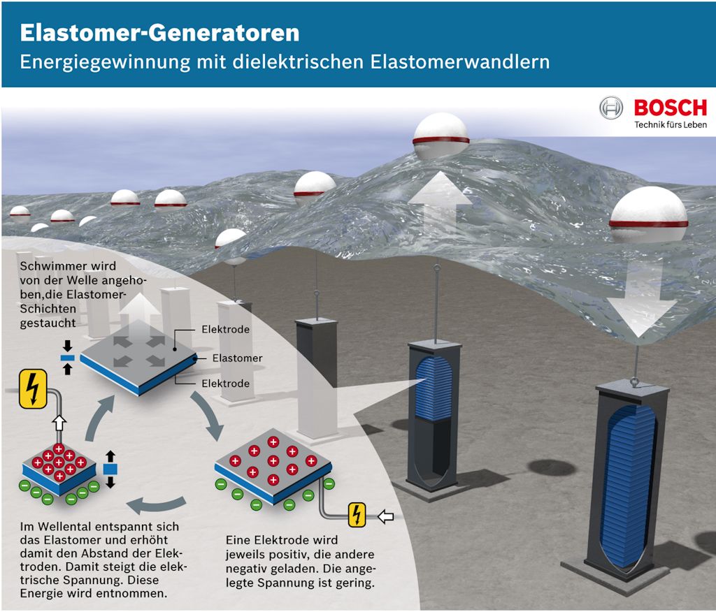 Das erste, maßstabgetreu verkleinerte Modell eines Wellen-Generators soll 2014 im Wellenkanal der Technischen Universität Hamburg-Harburg zu Wasser gelassen werden. Die Pläne sehen vor, dass kommerzielle Wellen-Generatoren mehrere zehnmillionen Dehnungs- und Stauchungsvorgänge absolvieren. Der angestrebte Wirkungsgrad bei der Wandlung der mechanischen in elektrische Energie liegt bei 50 Prozent. (BOSCH)