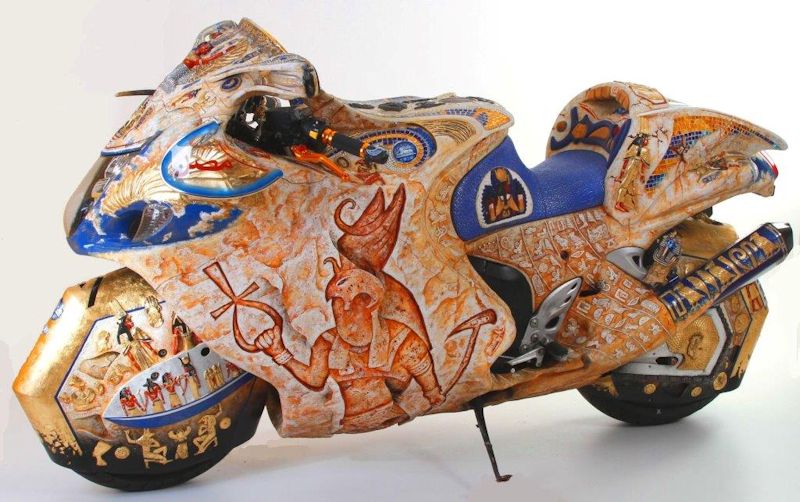 Die Idee dazu kam während einer Nilkreuzfahrt in Ägypten. Ehrschwendner war dermaßen von dieser bis zu 5000 v.Chr. zurückreichenden Kultur begeistert und fasziniert zugleich, dass noch am Flughafen in Ägypten die Idee für ein einzigartiges Motorrad geboren wurde. Es war klar, was aus seiner Suzuki Hayabusa einmal werden würde – ein königliches Gefährt. Wie die Pharaonen glänzt es in Gold. Hammer oder??! Hätte Ramses das Bike damals gefahren – es wäre seine Grabbeilage geworden! (Fotos: GE Design zur Berichterstattung Essen Motor Show)