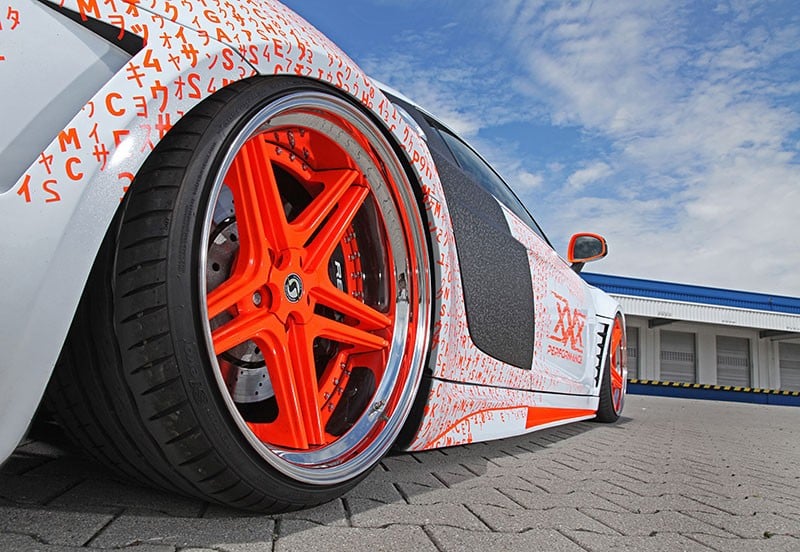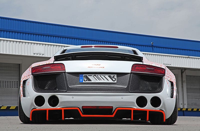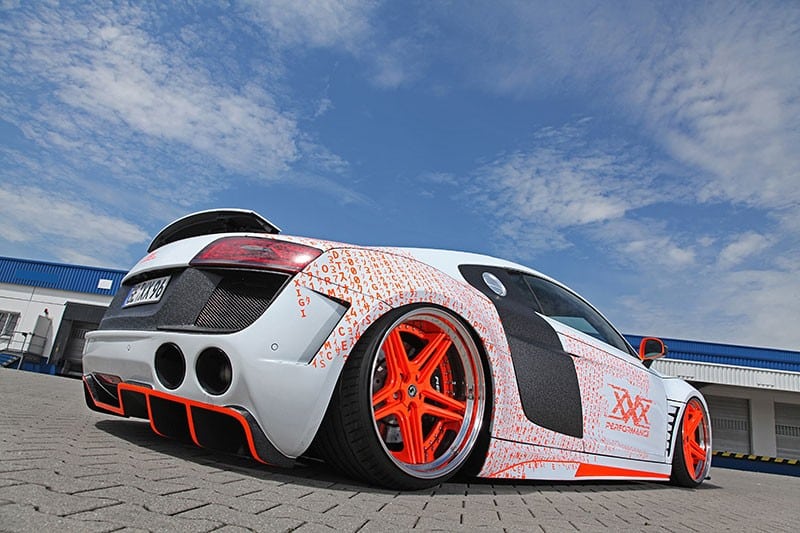 Die Karosserie des Audi R8 wird um 40mm (vorne) und 70mm (hinten) verbreitert. Bereift ist das Fahrzeug mit Hankook S1 Evo 305/25R20 in Verbindung mit 235/30R20 an der VA. Montiert auf 9,5Jx20et6 (vorne) und 12,5Jx20et2 (hinten). Dazu werden Radinox Betten in 5,5“ (hinten) und “ (vorne) mit konkaven FS-Line Felgen Sternen verschraubt. Tieferlegung mittels Luftfahrwerk auf Gewindefederbeinen. Auspuffsound steuerbar über eine Klappenanlage. Carbon Interieur kombiniert mit Alcantara.