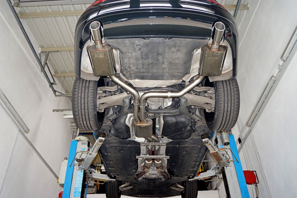 Die Verarbeitung der Abgase übernimmt eine hauseigene Edelstahl-Abgasanlage inkl. Vorschalldämpfer mit je einem 100 mm großen Endrohr rechts und links. Die Tuning-/ Umbaukosten für diesen Audi A8 betragen ca. 9.500 Euro.