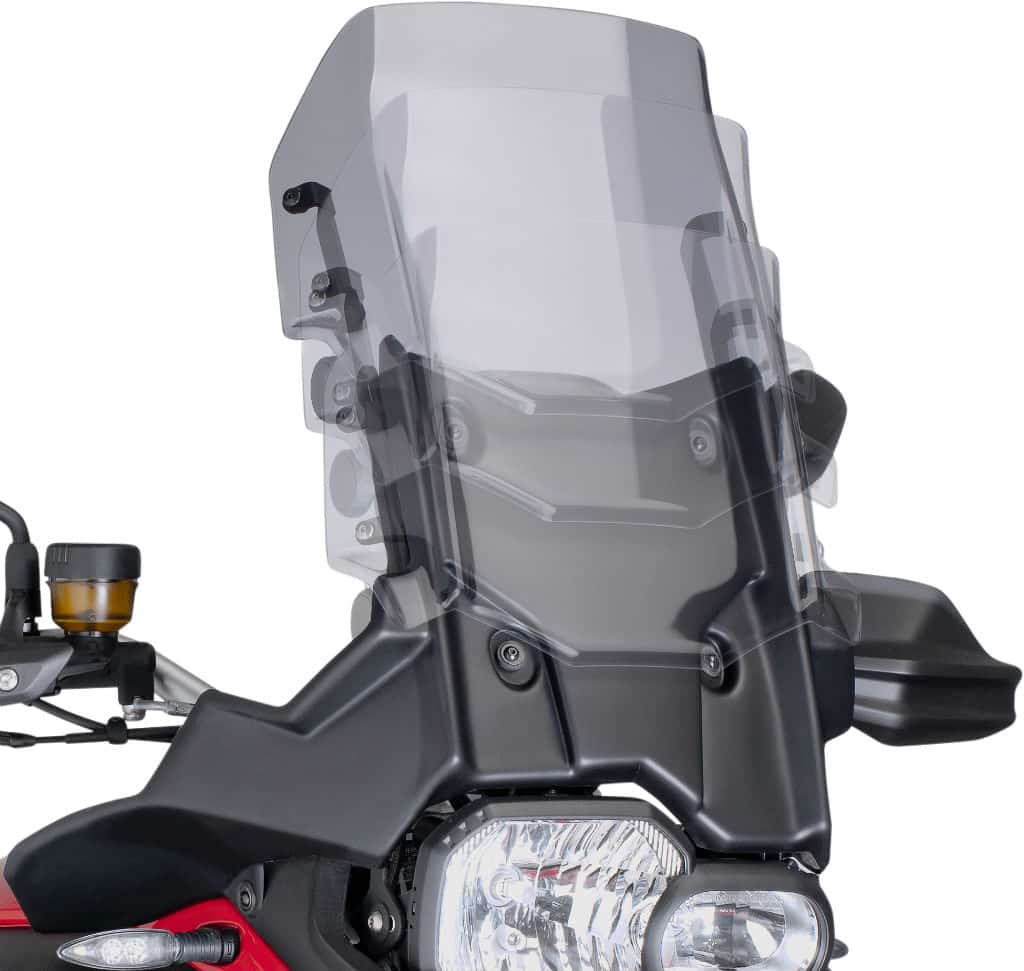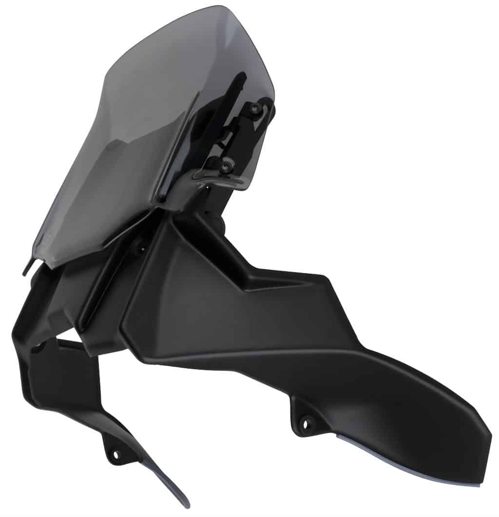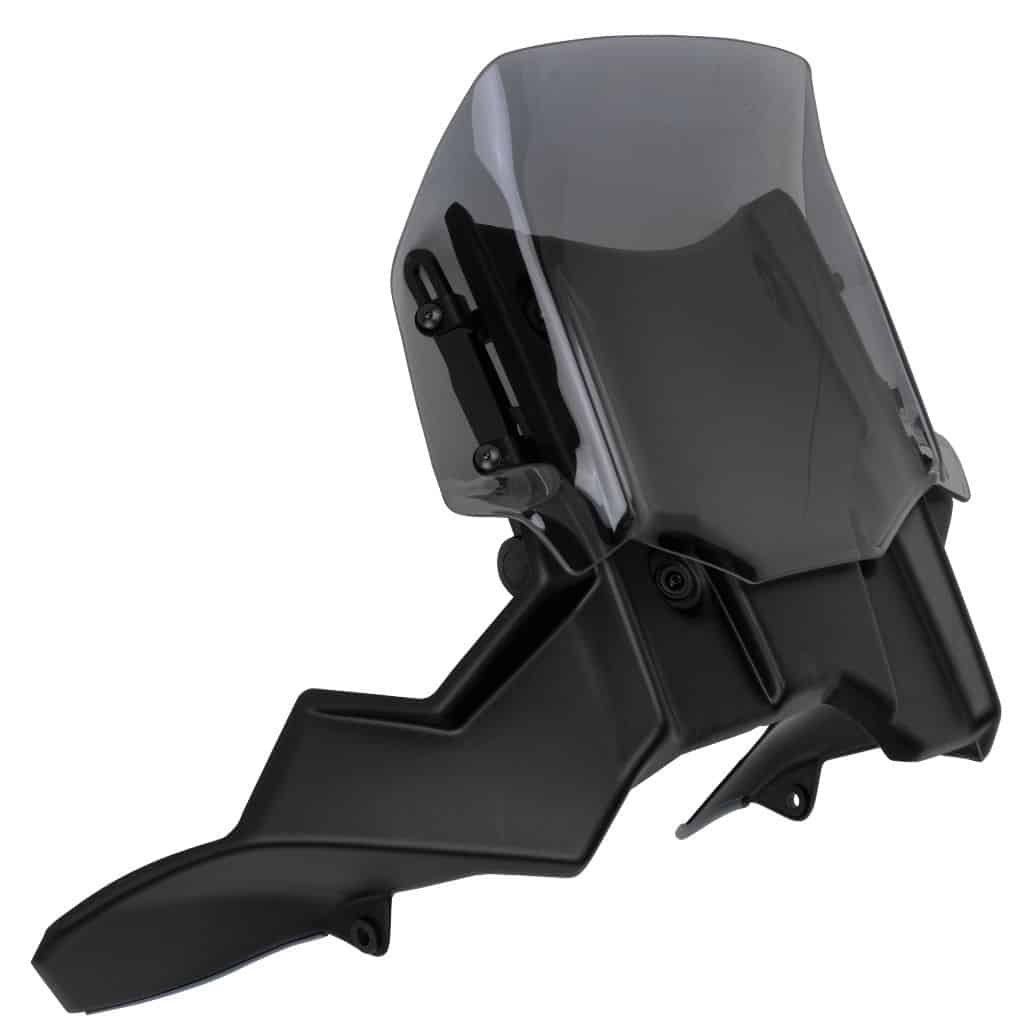 Die zweiteilige „RAID Vario“ Tourenscheibe ist in der Höhe mittels Schnellverschluss stufenlos verstellbar. Im oberen Bereich entlasten breite Flaps Kopf und Oberkörper laut Hersteller nahezu verwirbelungsfrei.