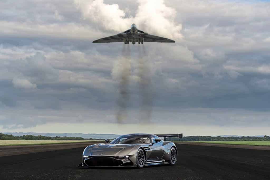 Das Bild ist keine billige Fotomontage. Hier trifft ein Aston Martin Vulcan auf seinen Namensgeber, den englischen Bomber „Vulcan XH558“, der demnächst in Ruhestand geht. Hat schon was. Frage mich, was mehr Laune macht. Ein Flug oder eine Fahrt mit dem Vulcan… (Foto: Aston Martin/Np)