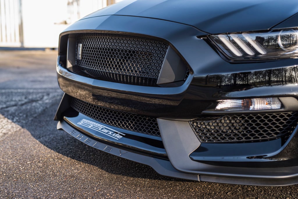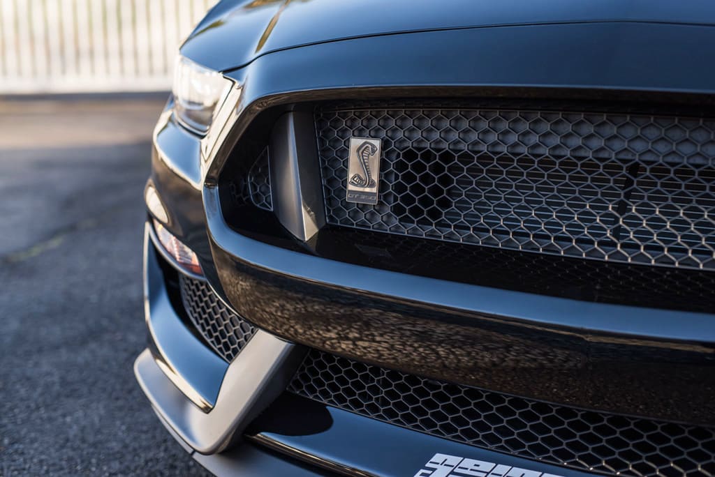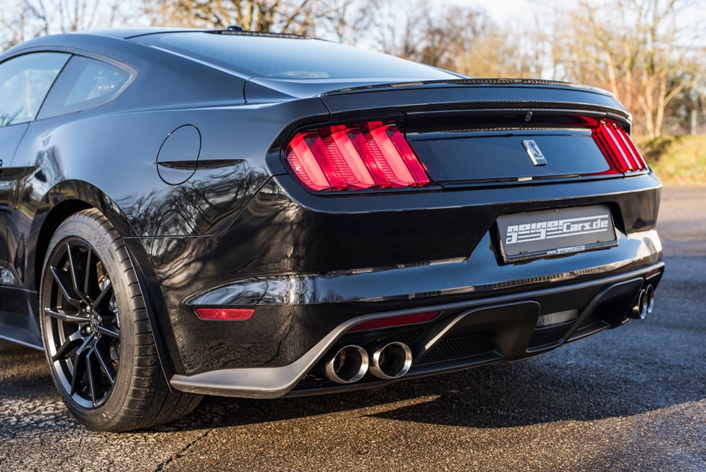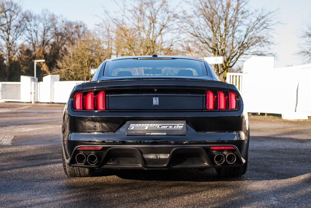 Erst auf den zweiten oder dritten Blick offensichtlich wird, dass der Shelby GT350 gegenüber den Standard-Mustangs einen komplett anderen Bug in den Fahrwind drückt: Sowohl die Frontschürze (noch bulliger) als auch die Motorhaube (flacher) und die vorderen Kotflügel (mit integrierten Luftauslässen) wurden modifiziert, unter anderem, um die um 35 Millimeter größere Spurweite der Vorderachse aerodynamisch effizient unterzubringen. Achtern trägt der GT350 einen ausgeformteren Heckeinsatz sowie eine recht dezente Abrisskante auf dem Kofferraumdeckel.