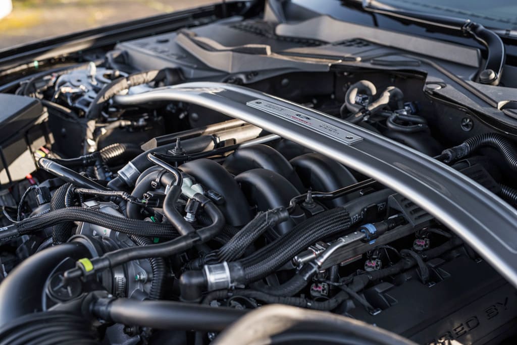 So donnert beispielsweise unter dessen langer Motorhaube ein ganz besonderer 5,2-Liter-V8. Im Unterschied zu den „normalen“ Mustang-Achtendern verfügt dieses umfassend modifizierte Racing-Triebwerk über eine gewichtsoptimierte Flatplane-Kurbelwelle mit einem Hubzapfenversatz von 180 Grad.
