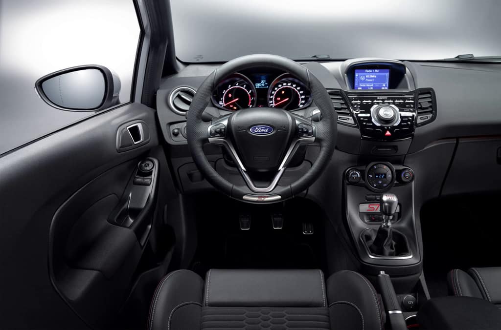 Weitere Besonderheiten des in „Storm Grey“ lackierten Fiesta ST200 sind 17-Zoll Felgen, rot lackierten Bremssättel und ein mit Leder und Ziernähten aufgewerteter Innenraum.