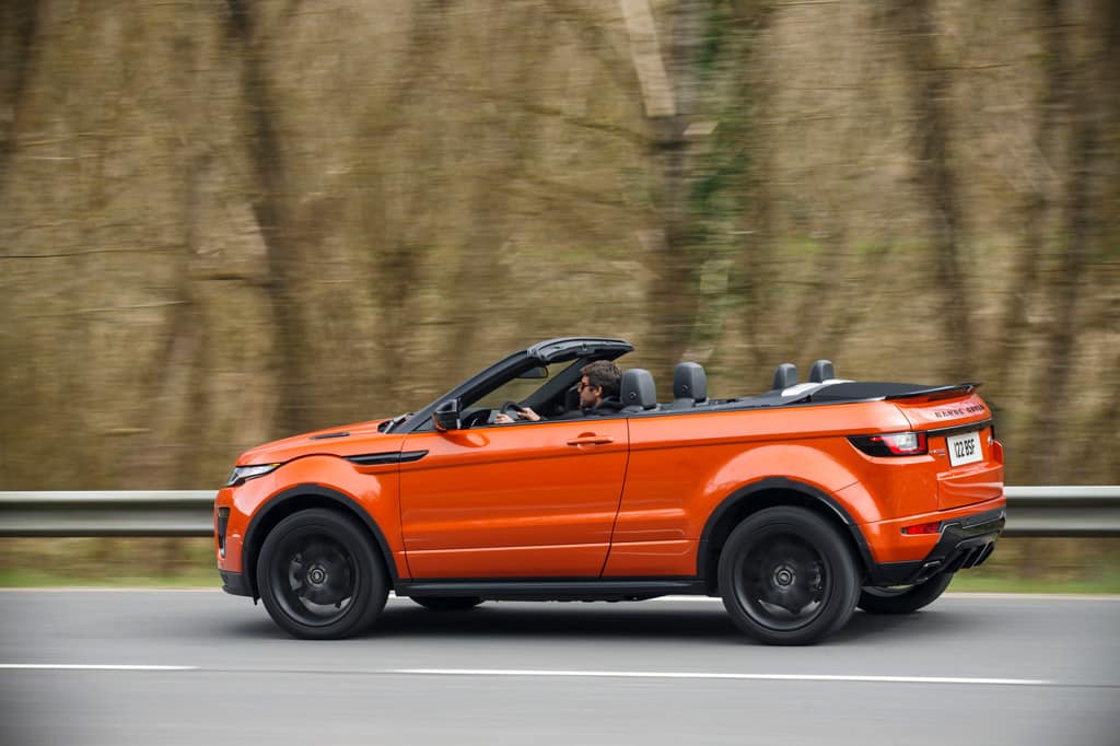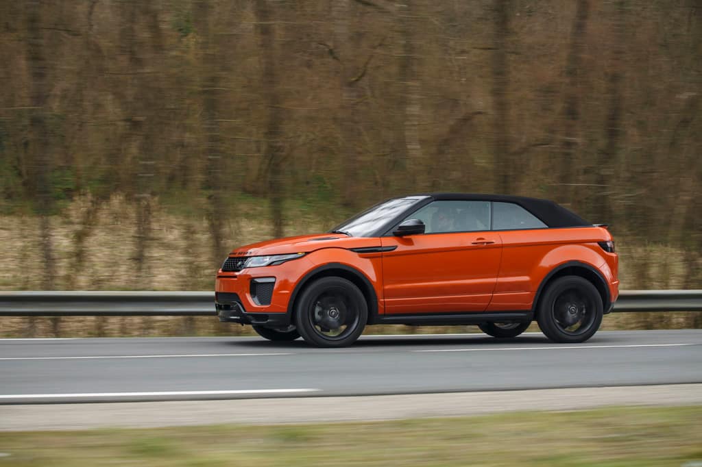 Die Karosserie soll trotz des fehlenden, sonst stabilisierenden Dachs genau so steif sein wie die des normalen Evoque. Das hat natürlich seinen Preis in Form von rund 200 Kilogramm Mehrgewichts. Die 180 PS und das Drehmoment von 430 Newtonmetern des Vier-Zylinder-Diesels haben mit den fast zwei Tonnen allerdings kein Problem.