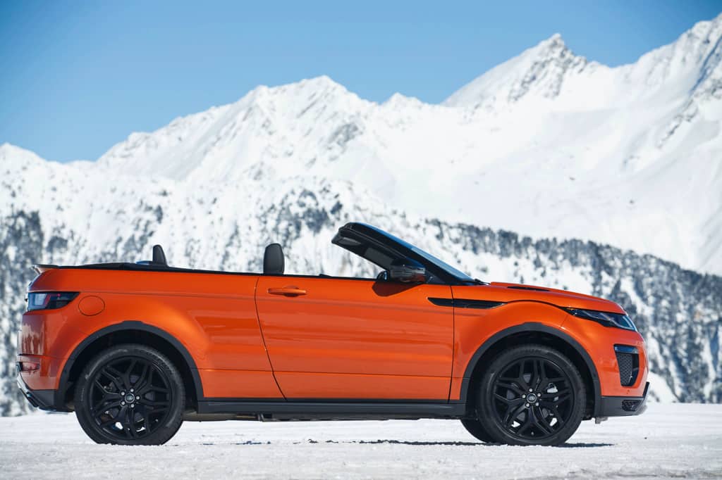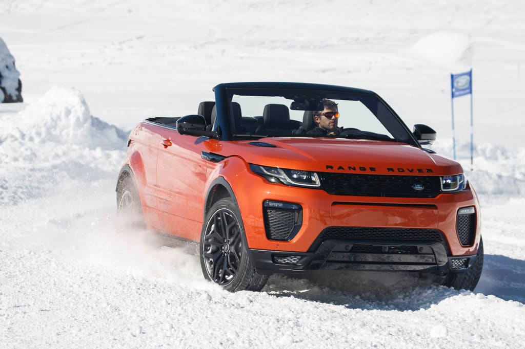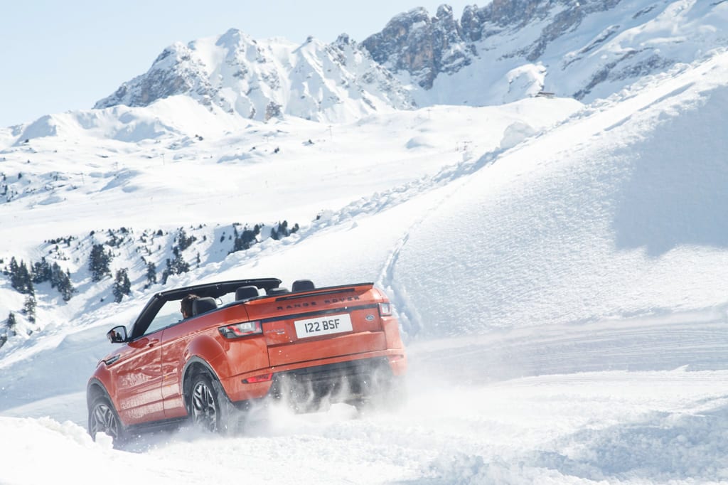 Auf dem festgefahrenen Schnee und auf der Geländestrecke in Courchevel trat das Test Range Rover Evoque Cabrio mit offenem Dach unter strahlend blauem Himmel den Beweis an, dass es für diesen Viersitzer mit Vierradantrieb auch eine vierte Jahreszeit gibt: den Winter, den man mit Heizung, Windschott und Mütze auch ohne Dach genießen kann.