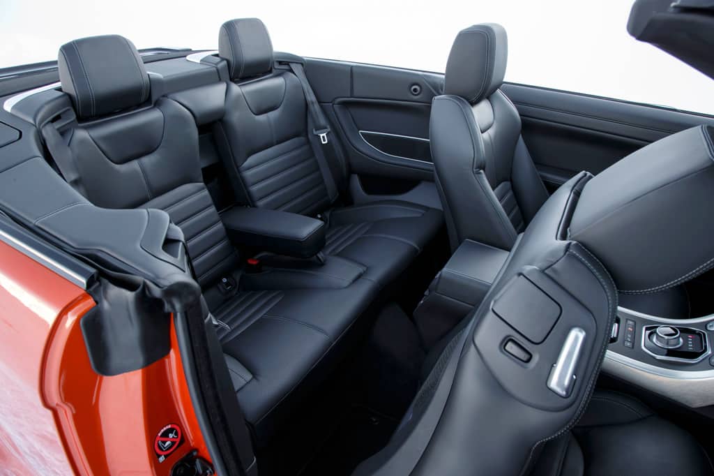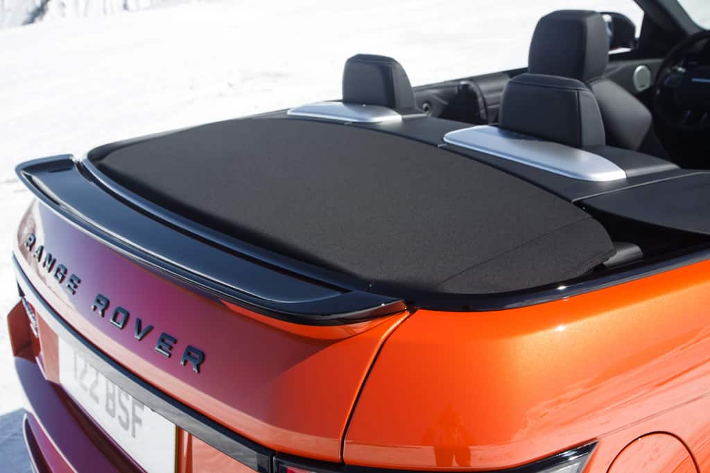 Offen sieht dieser Evoque aus wie ein Evoque mit abgeflextem Dach. Die Bordkante zieht sich, der Keilform folgend, in Chrom um den viersitzigen Innenraum. Das Dach faltet sich über dem 251 Liter großen Kofferraum Z-förmig so zusammen, dass es den Chromrand kaum überragt. Wenn das Cabrio so offen vor einem steht, könnte man meinen, McGovern habe zunächst sein optimales Cabrio und dann erst die Blechdach-Varianten gezeichnet.