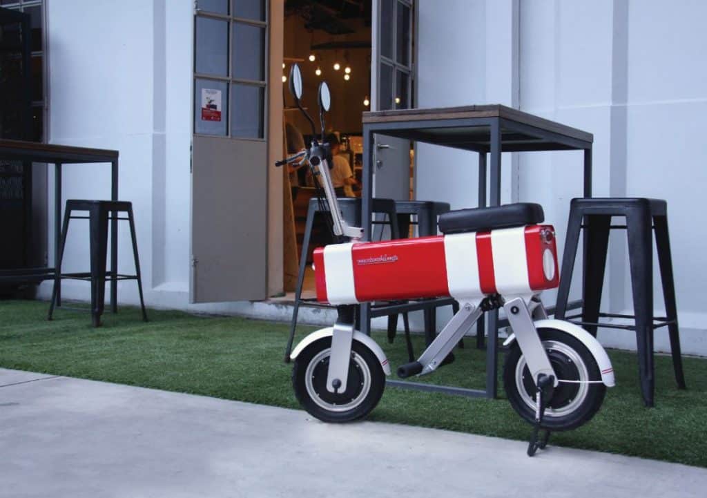 Die rollende Bahnschranke besteht zum Großteil aus Aluminium, der Elektromotor 48 Volt/350 Watt, soll für eine Vmax von 30km/h sorgen. Okay, für die Stadt reicht’s. Nur – na ja, Design ist eben Geschmackssache.