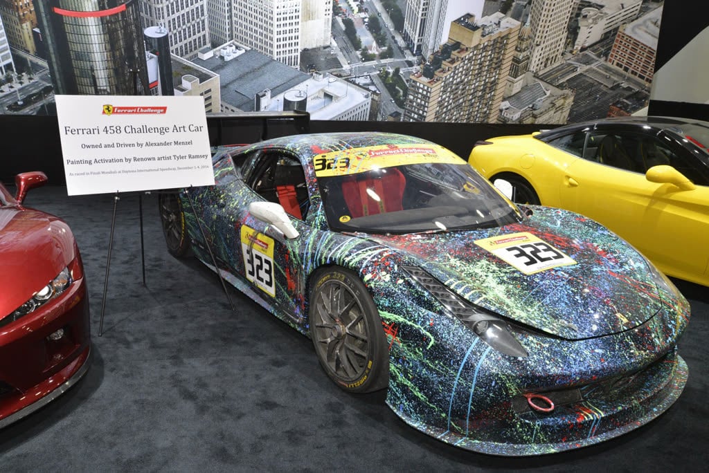 War was? NAIAS! Auf der North American International Motor Show gibt es neben diversen Tuning- und PS Monstern auch zivilisierte Sportwagen zu sehen. Wie den Ferrari 458. Bei diesem Ausstellungsstück ist nicht etwa die Software der Lackierroboter gehackt worden, es handelt sich schlicht um ein „Art Car“. (Foto: np)