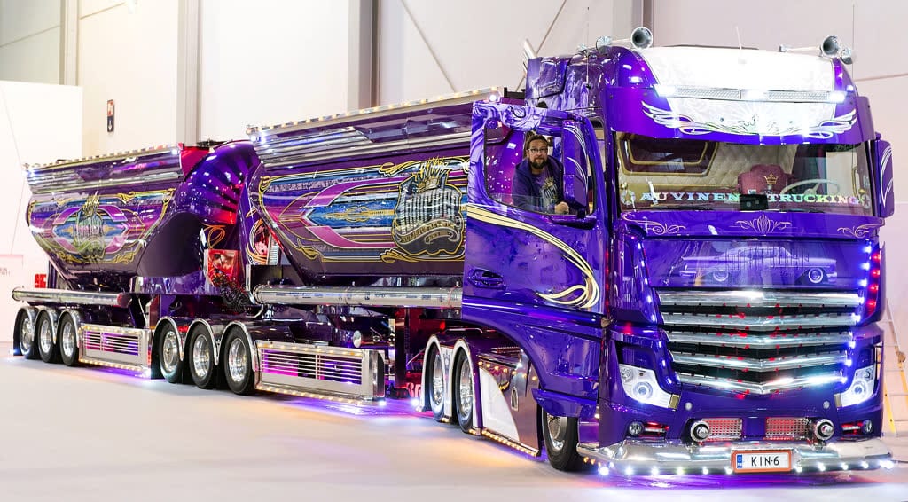 Violett ist Maras Lieblingsfarbe: mit dem Mercedes-Benz Actros 2663 Lowrider gewinnt der Besitzer Mika Auvinen nicht nur Titel auf Festivals, sondern er verdient damit auch seine Brötchen. Denn der farbenfrohe 76 Tonnen schwere Blickfang, angetrieben von einem 15,6-Liter-Motor mit 625 PS Leistung, wird im Logistikgewerbe eingesetzt und transportiert normalerweise Zement.