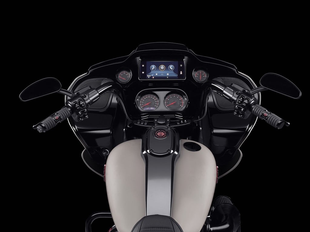 Die zweiteilige Low-Profile-Tankkonsole hat ein beleuchtetes CVO-Logo, eine rahmenfste Sharknose-Verkleidung und exklusive Sieben-Doppelspeichen-Felgen.