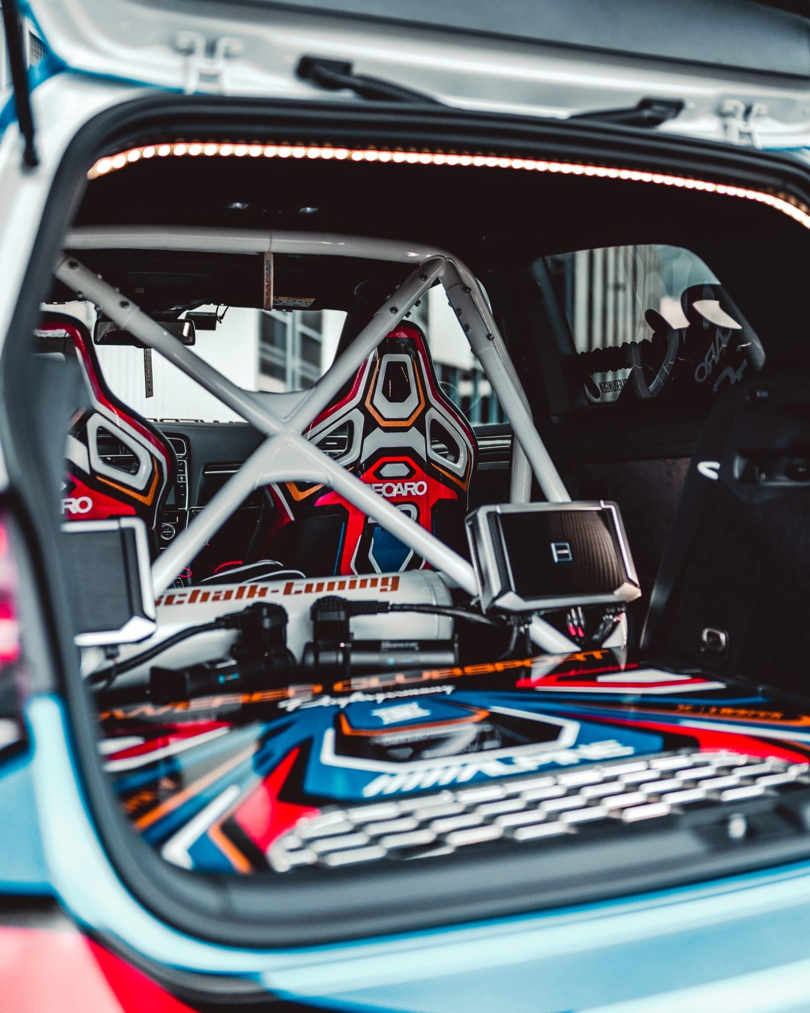 Der Druckaufbau fürs Fahrwerks erfolgt durch zwei Kompressoren, der Lufttank ist in der Wagenfarbe lackiert und foliert. Im Motorraum springt zudem eine Carbon-Domstrebe von Wiechers ins Auge.