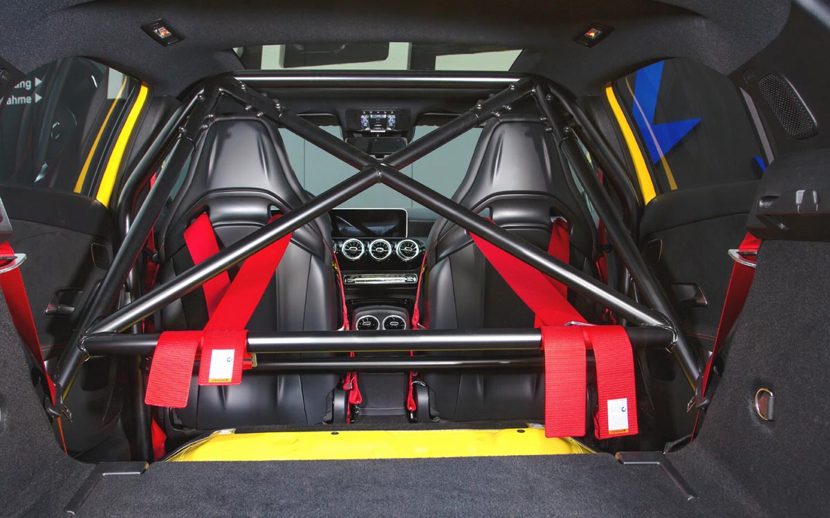 Anstelle einer Rücksitzbank findet sich im POSAIDON A 45 RS 525-Tracktool ein abgestützter Wichers-Clubsport-Überrollbügel mit Kreuz, welcher die Insassen im Fall eines Abflugs vor dem Schlimmsten bewahrt und dessen Querstrebe zugleich als Fixpunkt für deren rote Schroth-4-Punkt-Sicherheitsgurte dient.
