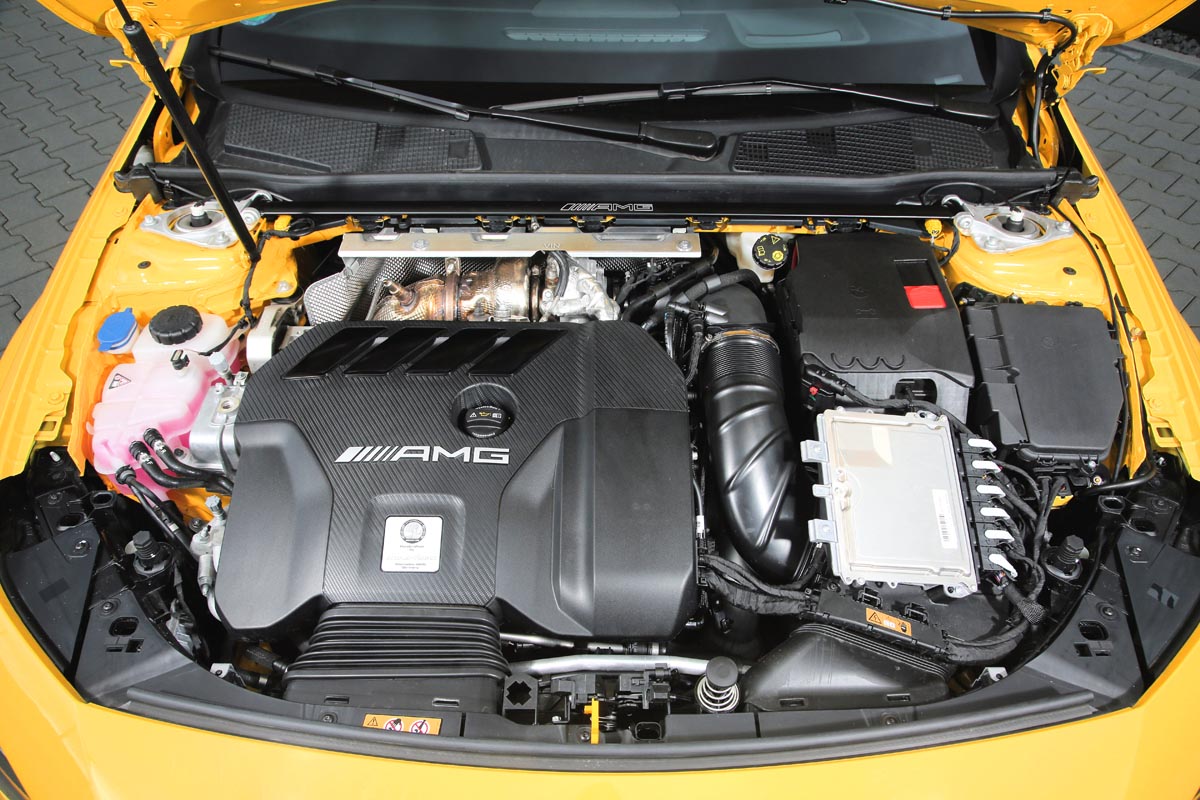 Doch auch beim stärksten Serien-Vierzylinder der Welt geht noch was. Das im letzten Frühjahr präsentierte Ergebnis ist der POSAIDON A 45 RS 525, welcher infolge der Installation eines effizienteren Upgrade-Turboladers sowie einer Kennfeldoptimierung des Motorsteuergeräts nun sogar – nomen est omen – bis zu 525 PS und stolze 600 Nm aus dem M 139-Vierzylinder schöpft.