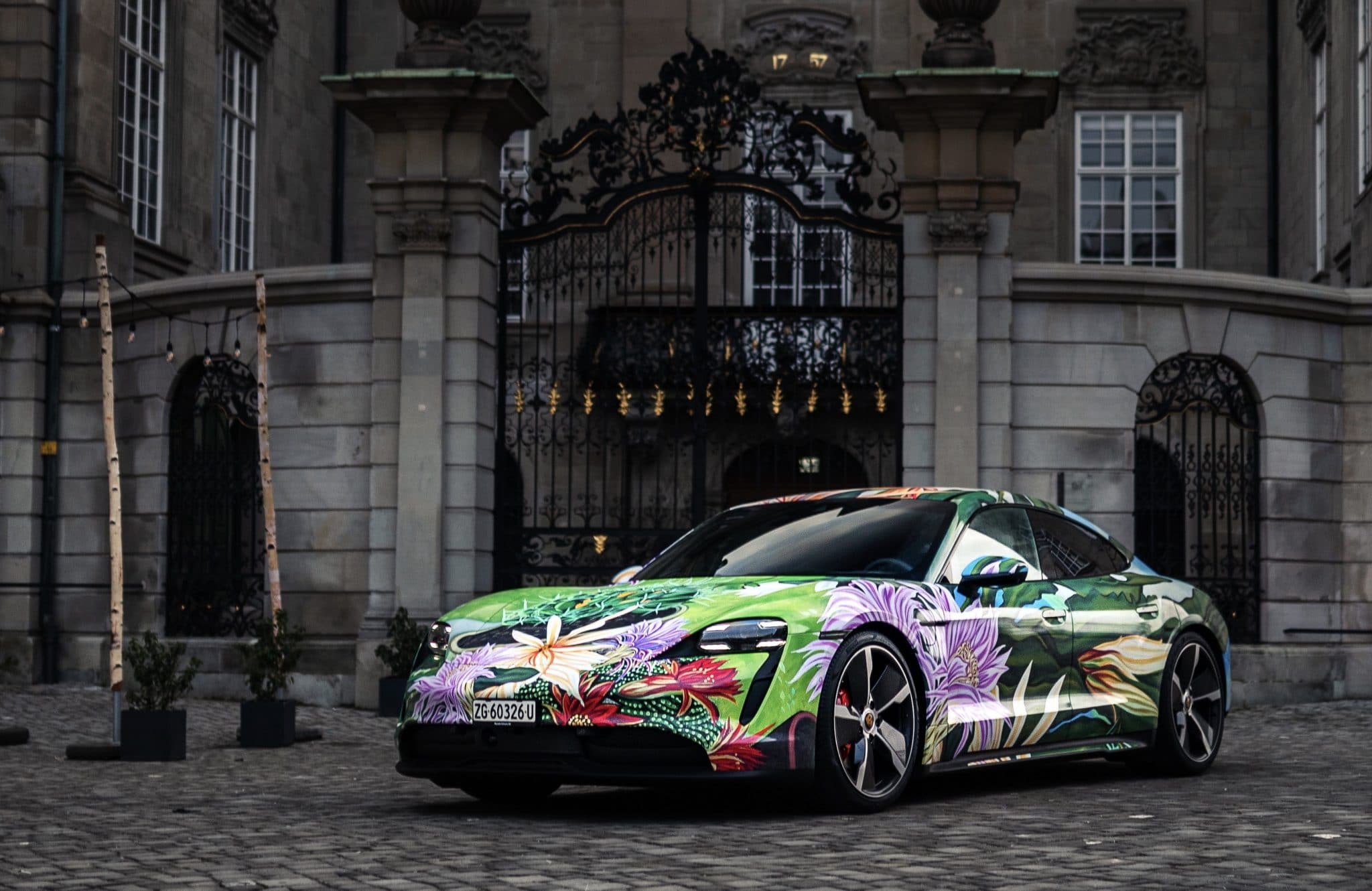 Gute blumige Porsche Taycan Idee der Porsche Schweiz AG. In Zusammenarbeit mit dem amerikanischen Künstler Richard Phillips entstand im Dezember vergangenen Jahres live im Pop-up-Restaurant Leuehof an der Zürcher Bahnhofstrasse das Porsche Taycan Artcar als Einzelstück.