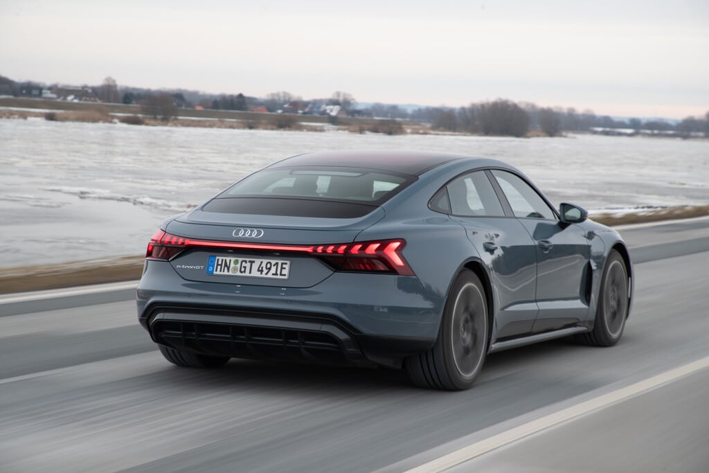 Die Karosserie des Audi e-Tron GT ist aerodynamisch perfekt ausgefeilt, und die im Vergleich zum auf der gleichen Plattform stehenden Porsche Taycan deutlich größere Reichweite lässt erahnen, dass Audi mit dem angegebenen cw-Wert von 0,24 eher tief stapelt.
