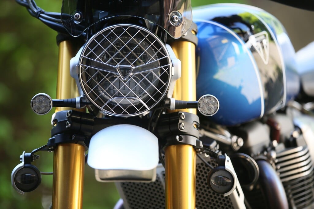 Eines fällt uns bereits vor dem Triumph Scrambler 1200 XE Test auf: die Aufhängung der kurzen Alu-Schutzbleche, die Startnummerntafel aus gebürstetem Aluminium, der massive Fersenschutz, die Lampenhalter, der Alu-Klapptankdeckel im Monza-Style, das Edelstahl-Tankband – jedes Teil strahlt eine Perfektion und Liebe zum Detail aus, die es in dieser konsequenten Umsetzung nur ganz selten und bei wenigen Herstellern gibt.