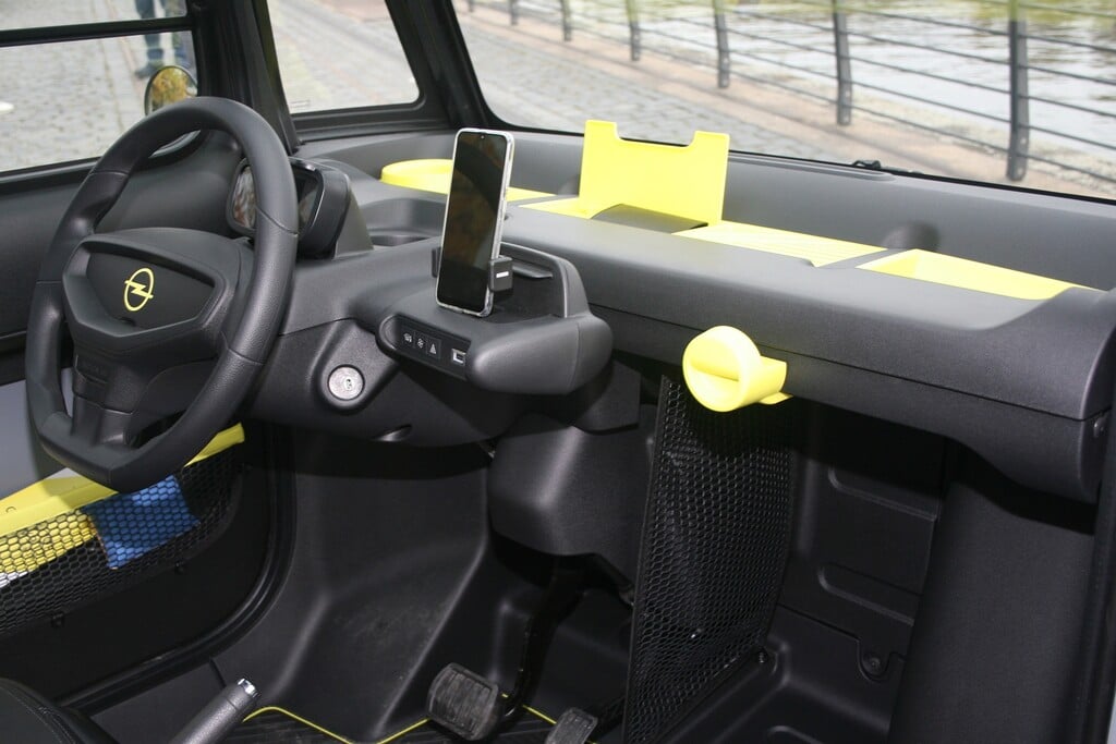 Das hat seinen besonderen Grund, denn der Mini-Opel hat keinen Kofferraum. Stattdessen liegt vor dem Fußraum ein offenes Stauabteil mit 63 Litern Volumen, das zum Beispiel einen Handgepäckstrolley oder eine Reisetasche beherbergen kann.
