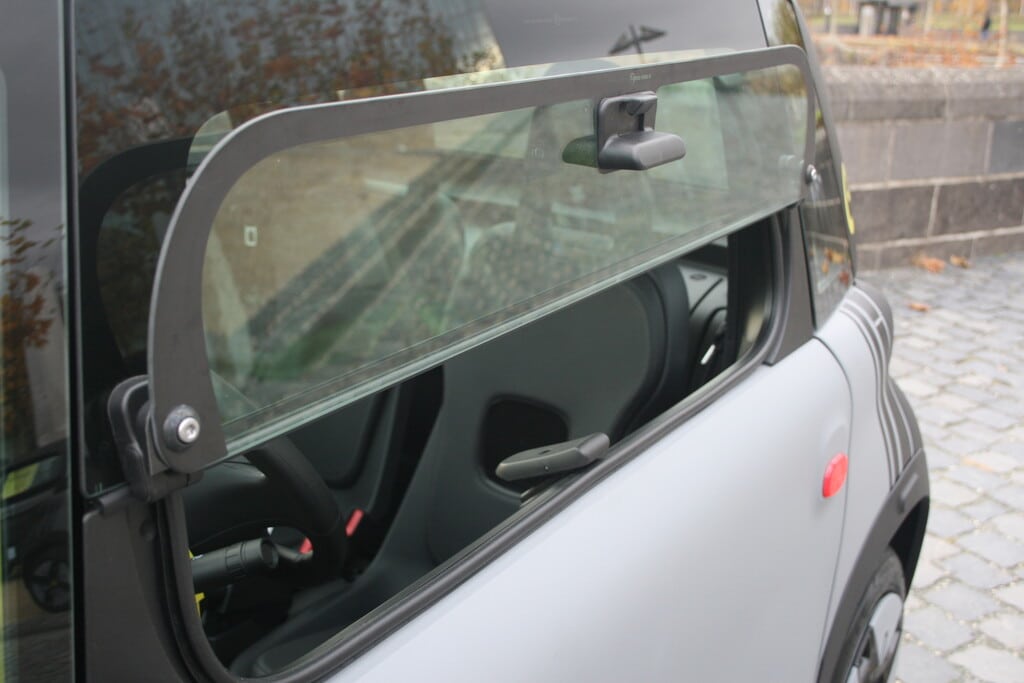 Der Opel Rocks-e ist ein Minimalist. Front-und Heckpanel sind identisch geformt, nur anders bestückt und selbst die Türen sind absolut identisch. Das führt dazu, dass auf der Beifahrerseite der Ein- und Ausstieg ganz normal erfolgt, auf der linken Seite aber die um 180 Grad gedrehte Tür hinten angeschlagen ist und entgegengesetzt öffnet und schließt. Apropos öffnen und schließen.