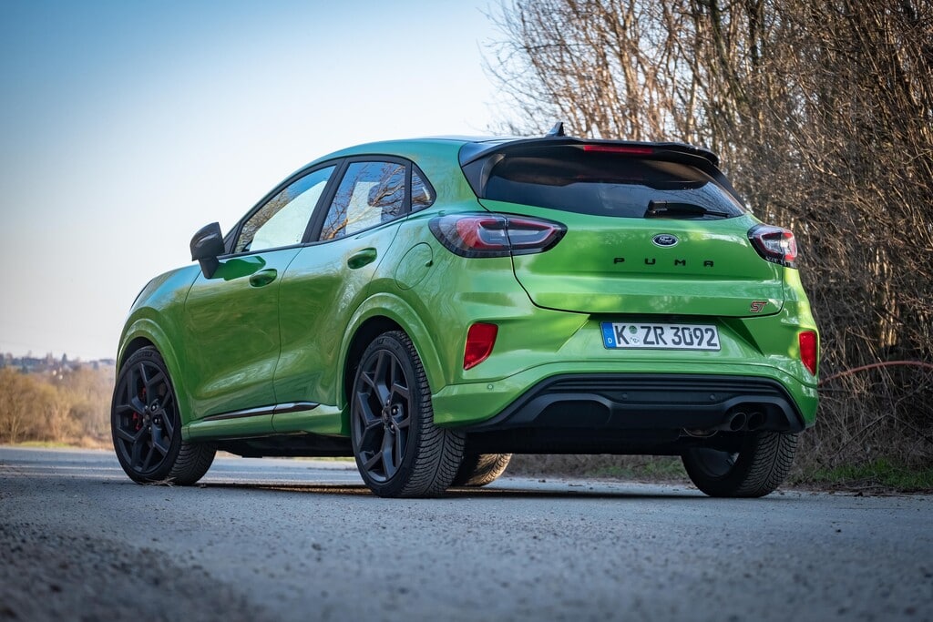 „Mean Green“ heißt die Farbe die unser Ford Puma ST Test Fahrzeug trägt. Mit so viel Frische im Lack heitert der Puma den Verkehr und die täglichen Strecken ungemein auf. Auch das Außenkleid, das sich durch ein dezentes Aerodynamik-Kit, eine schwungvoll abfallende und am Heckspoiler wieder ansteigende Dachlinie sowie ein sportlich-modernes Felgendesign definiert, sticht im Verkehr eindeutig heraus.