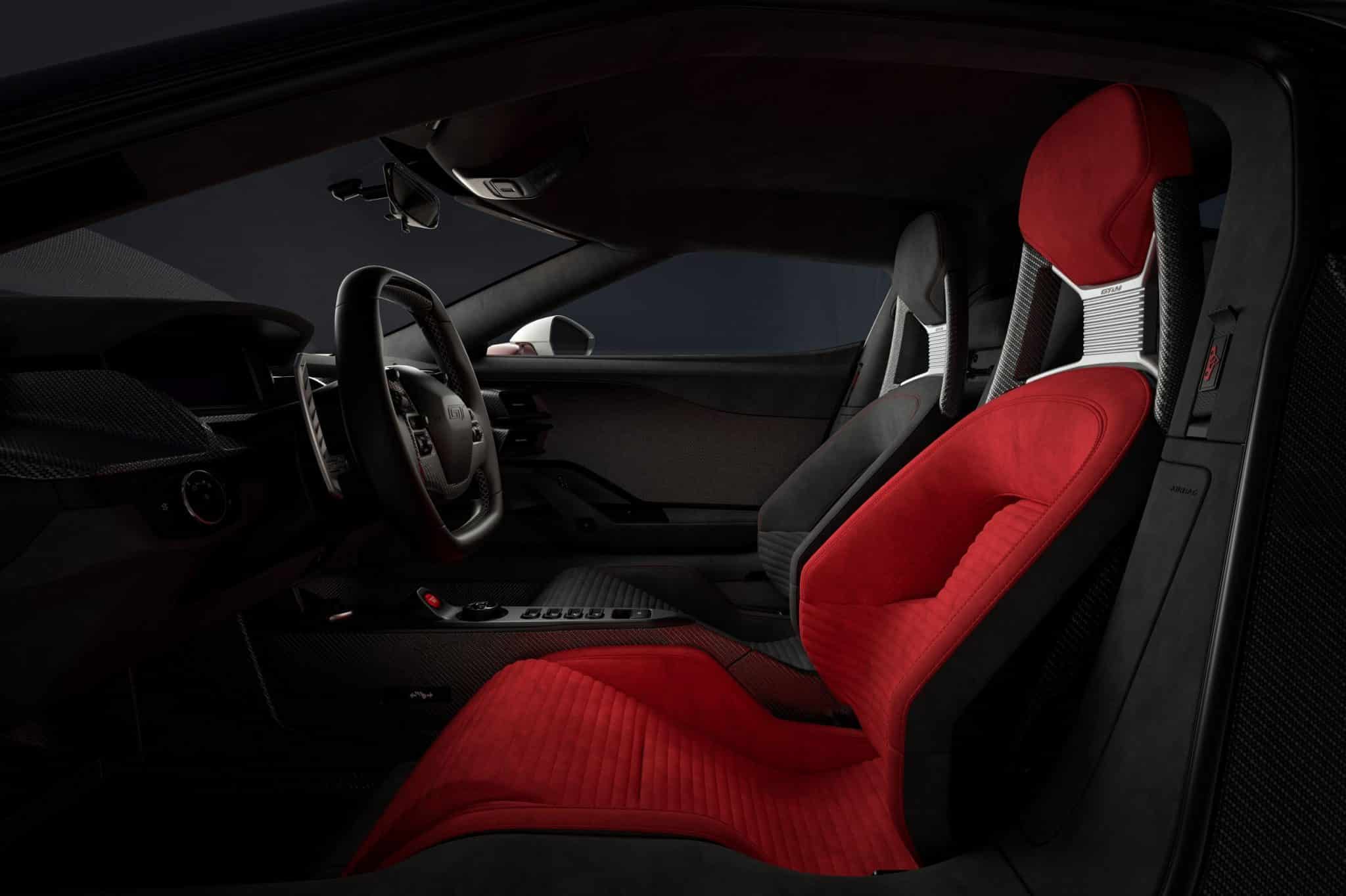 Das Interieur prägen die exklusiven Alcantarasitzbezüge. Auf der Fahrerseite werden sie – dem Design-Thema der Karosserie entsprechend – in Rot oder Blau ausgeführt. Den Beifahrersitz ziert Ebenholz-Schwarz mit farblich angepassten Ziernähten.