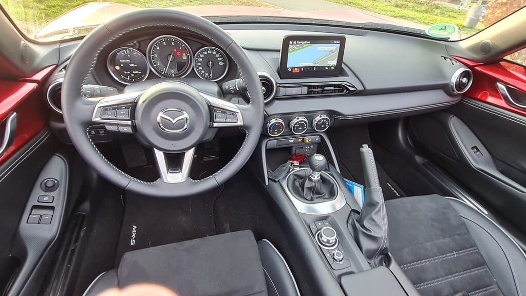 Der Schalthebel ist eher ein Stick und ein Feind der langen Wege, aus dem Handgelenk heraus lassen sich die Gänge wechseln. Genauso, wie der Mazda sich mit sehr sparsamen Lenkbewegungen um die Kurven treiben lässt.
