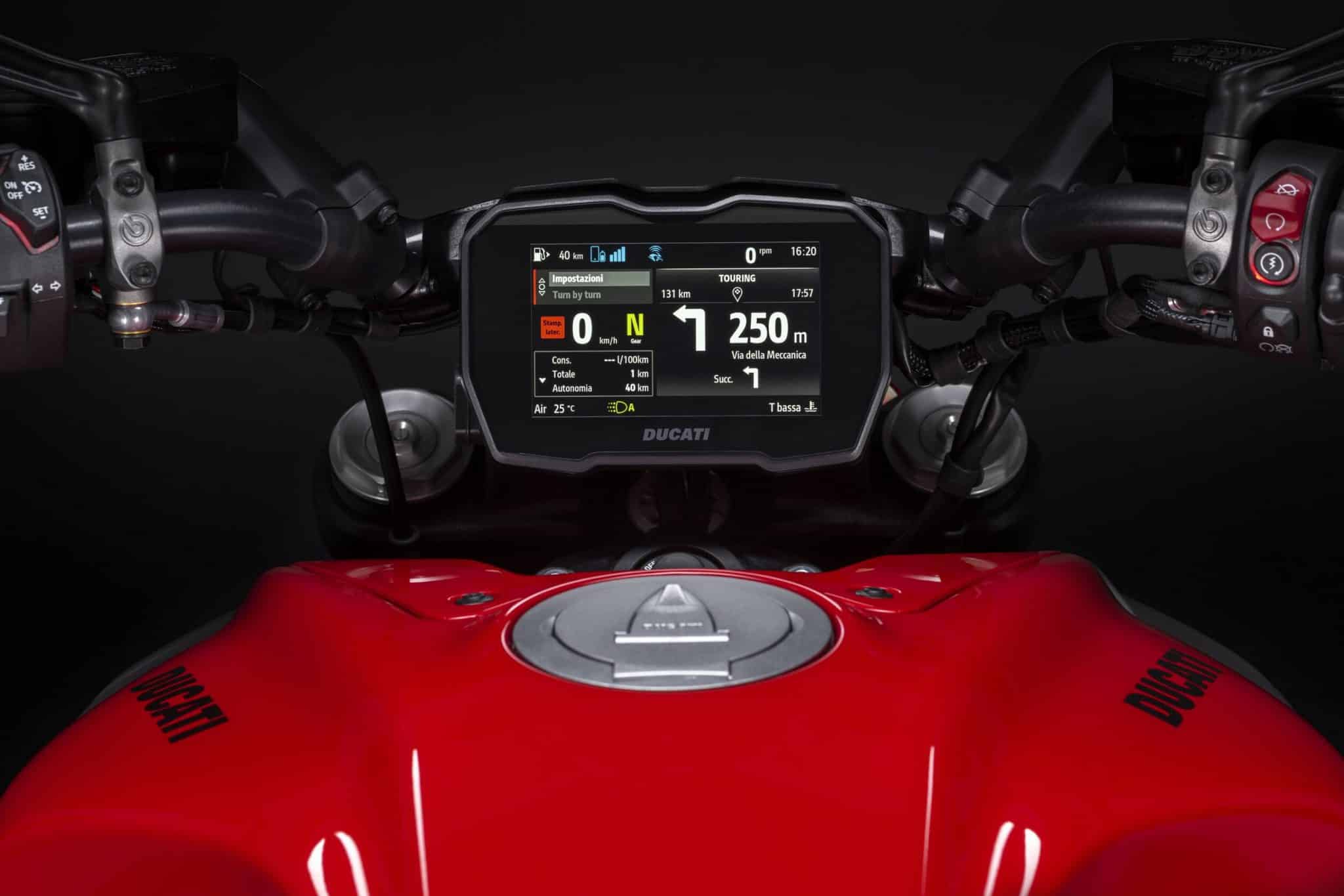 Das Ducati Turn-by-Turn-Navigation System ermöglicht in Verbindung mit einem Headset im Helm auch die Sprachansage zu zeigen. Zudem wird die gefahrene Strecke zusammen mit allen Daten über Geschwindigkeit, Schräglagen und die während der Fahrt aufgenommenen Fotos gespeichert.