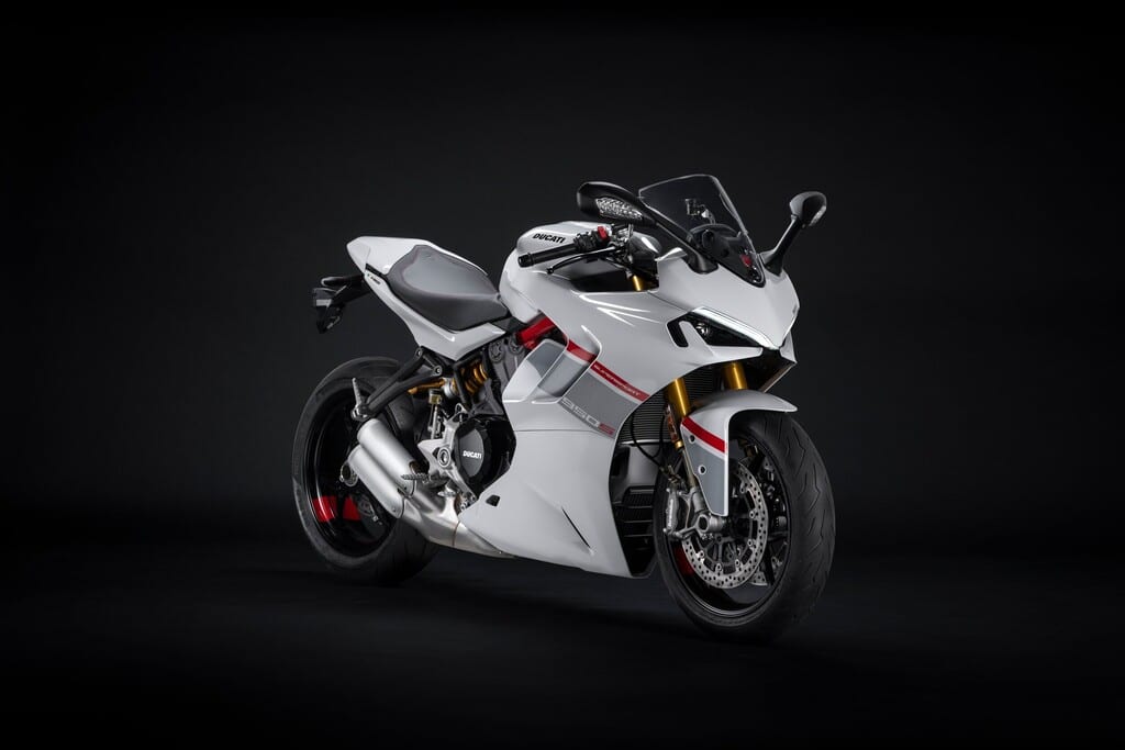 Auffallend an der Ducati Supersport 950 S Stripe Livery ist ein schmaler roter und ein breiter grauer Streifen (Stripe) auf der Grundfarbe „Iceberg White“.