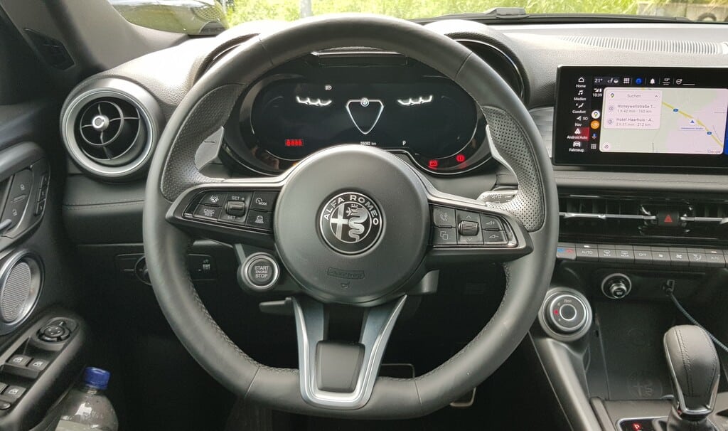 Der Fahrer blickt auf ein gut sortiertes Cockpit mit tubenförmig gestaltetem Digital-Kombidisplay, in dem als lustiges Gimmick beim Starten ein Scheinwerfer-Scudetto-Gesicht aufleuchtet. Davor prangt ein griffiges Drei-Speichen-Sportlenkrad mit Schaltpaddels und allerlei Multifunktionstasten.