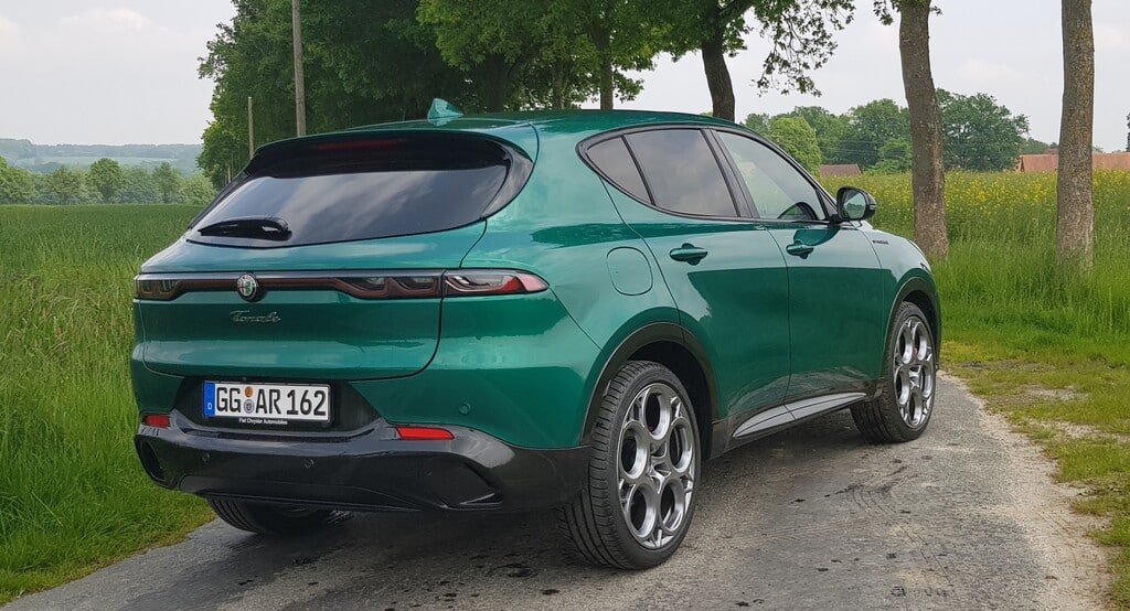 Wohl wahr, nicht nur in der metallic-grünen Lackierung „Verde Montreal“ (1500 Euro) ist der Tonale ein echter Hingucker. Auch die coupé-artige Silhouette, die großen Räder mit den 5-Loch-Felgen oder das elegante Rückleuchten-Band machen was her.